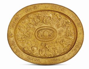 Lombardia, secolo XIX GRANDE VASSOIO DA PARATA in cera di forma ovale, bordo intagliato a mascheroni da cui si [..]