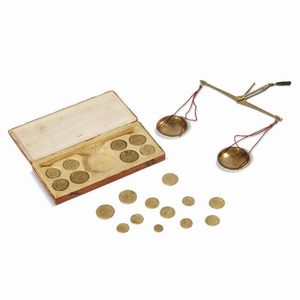 Italia, fine secolo XVIII BILANCINA DA MONETE con venti pesi monetali, di Francia, Spagna, Genova, cm 17,5x8 [..]