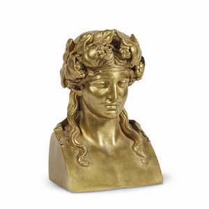 Toscana, inizi secolo XIX ERMA DI DIONISO in bronzo dorato, il dio è raffigurato imberbe con i capelli [..]