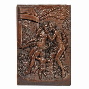 Europa centrale, secolo XVIII GIOVE E EUROPA - EFESTO E PANDORA coppia di rilievi in mogano di forma rettangolare, [..]