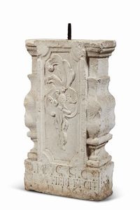 Veneto, secolo XVI BASAMENTO FIGURATO in pietra d'Istria, datato 1567, con stemma scolpito sul fronte e iscrizione [..]