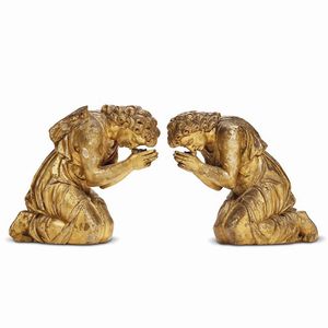 Veneto, secolo XVII COPPIA DI ANGELI ORANTI in legno intagliato e dorato, raffigurati inginocchiati e a tutto [..]