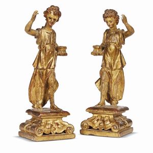 Toscana, inizi secolo XVII COPPIA DI FIGURE in legno intagliato e dorato e dipinto, poggianti su base di gusto [..]