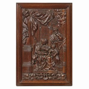 Toscana, secolo XVIII EDUCAZIONE DI MARIA rilievo in noce di forma rettangolare, cm 91x61,5 Tuscan, 18th century, [..]