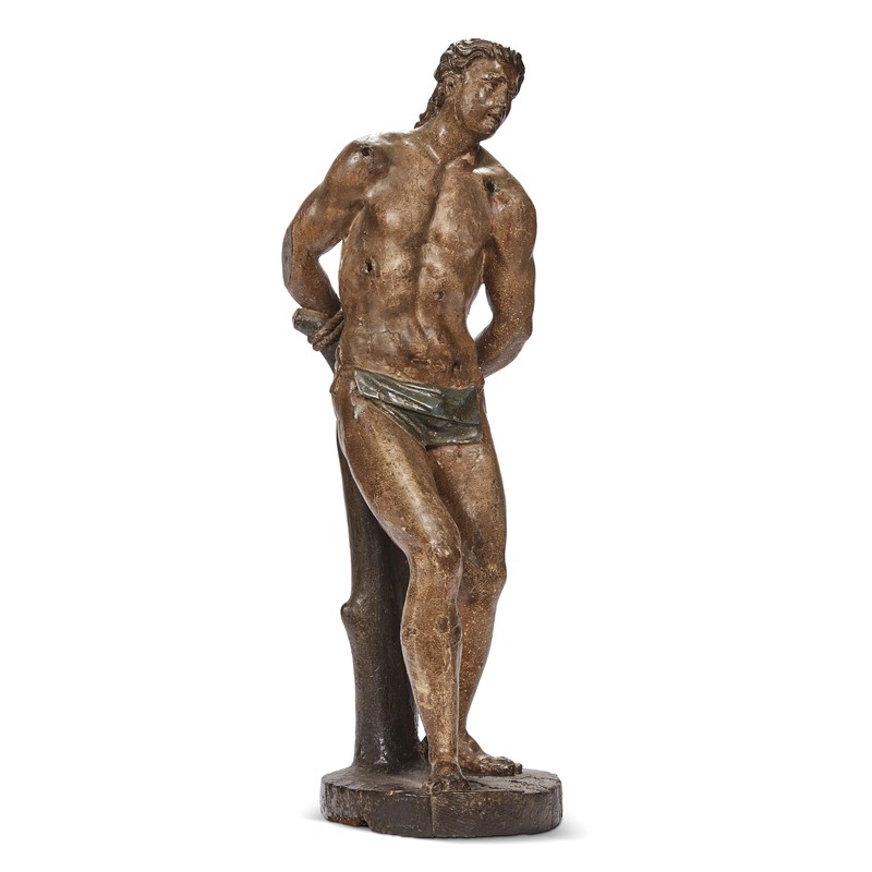 Lombard School, 17th century, Saint Sebastian, carved and painted wood, 70x21x25 cm