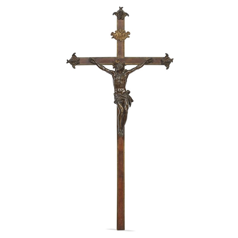 Tuscan, 17th century, Crucified Christ, patined bronze, 43x35,5 cm, mounted on a mahogany cross enriched with bronze, embossed and gilded copper applications, 119x57,5 cm (overall)
