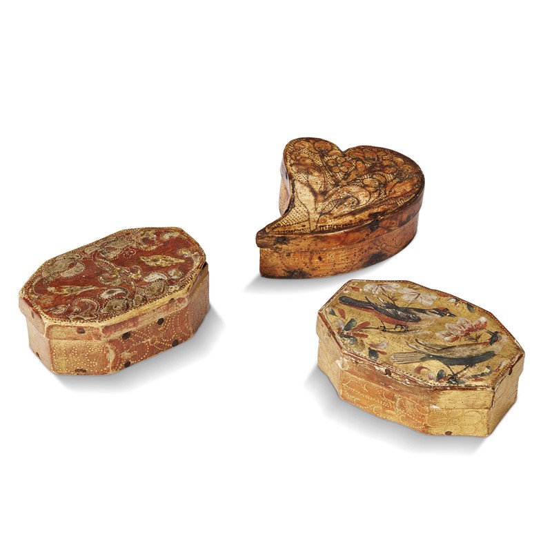 Tuscan, 18th century, Three small boxes, painted and gilt wood, 13x4,7 cm; 12,5x4,5 cm and 14,3x4 cm