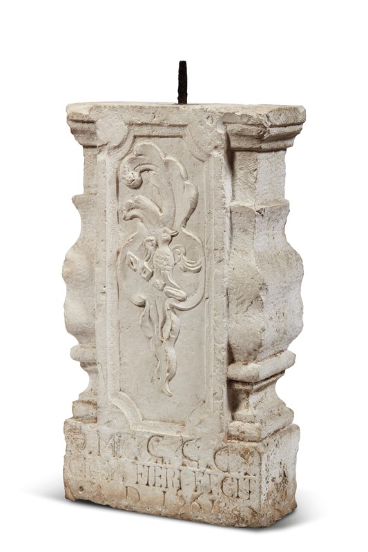 in pietra d'Istria, datato 1567, con stemma scolpito sul fronte e iscrizione alla base, cm 70,5x39x17