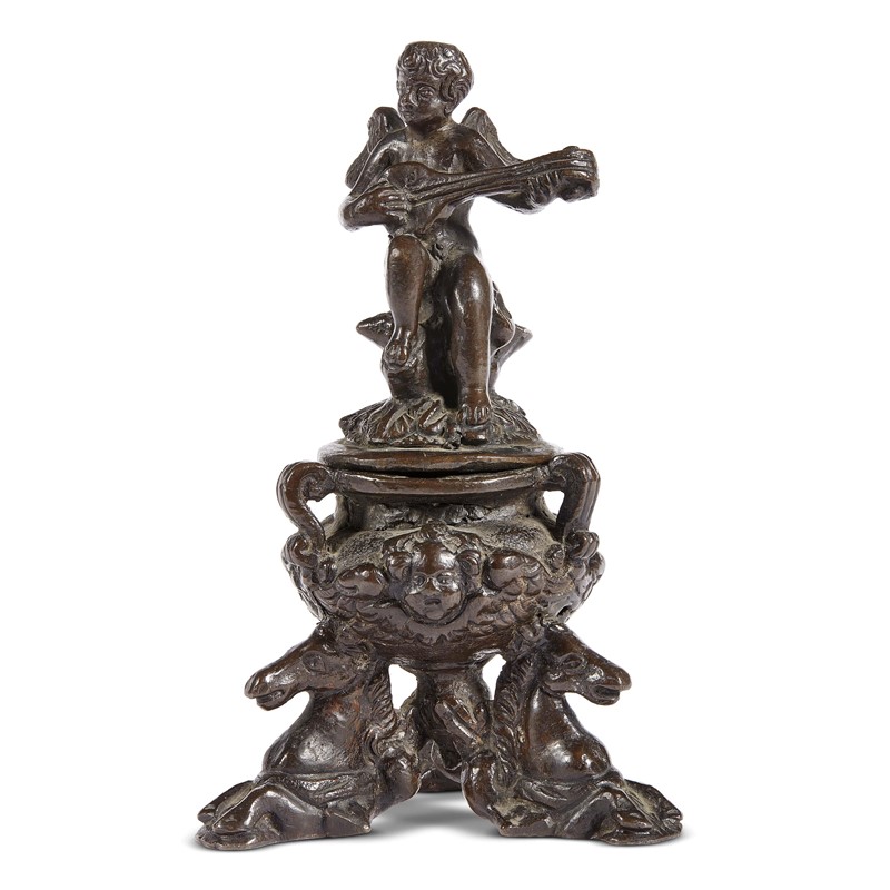 in bronzo, in forma di vaso triansato, poggiante su protome equine e con coperchio sormontato da amorino che suona il liuto, cm 15,5x10x10