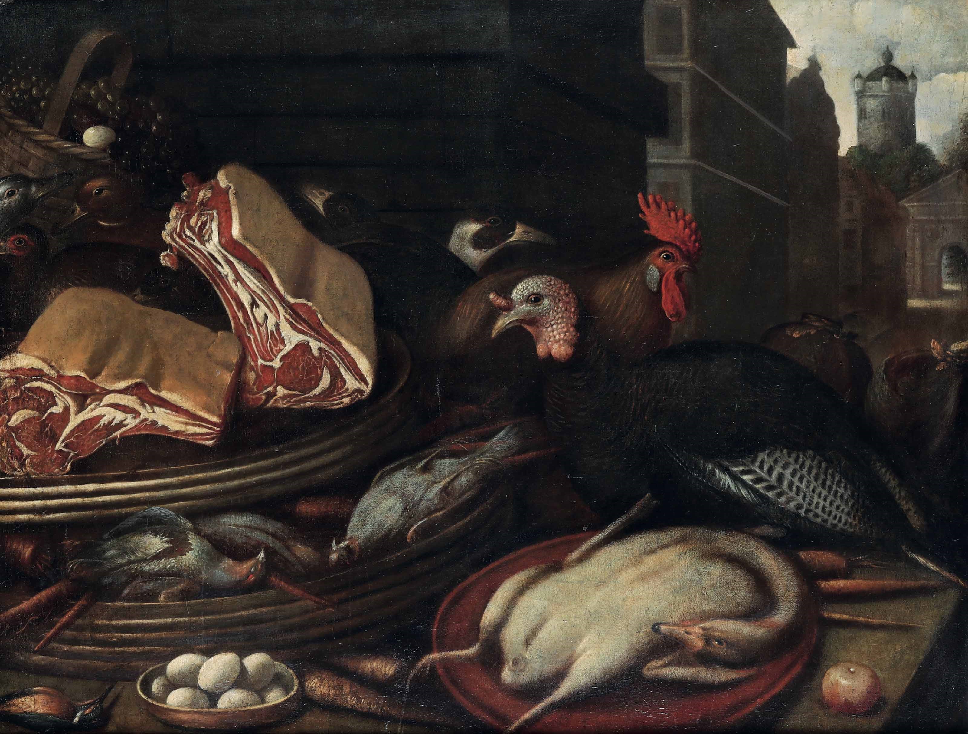 Banco di mercato con carni e animali da cortile