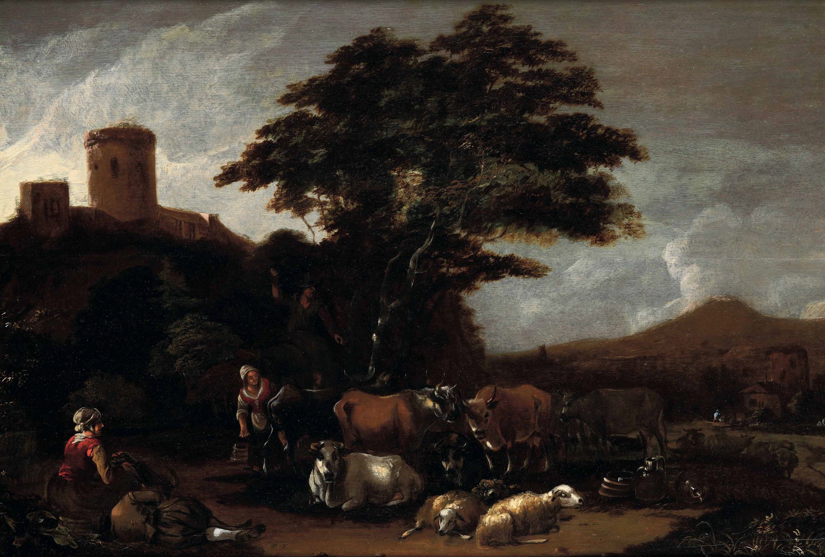 Cornelis Saftleven (1607 Gorinchem - 1681 Rotterdam) Paesaggio con pastori e arm [..]