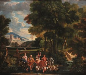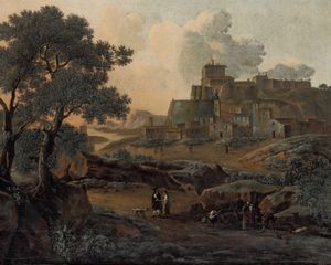 Scuola romana del XVII secolo Paesaggio con contadini e cittadella sullo sfondo