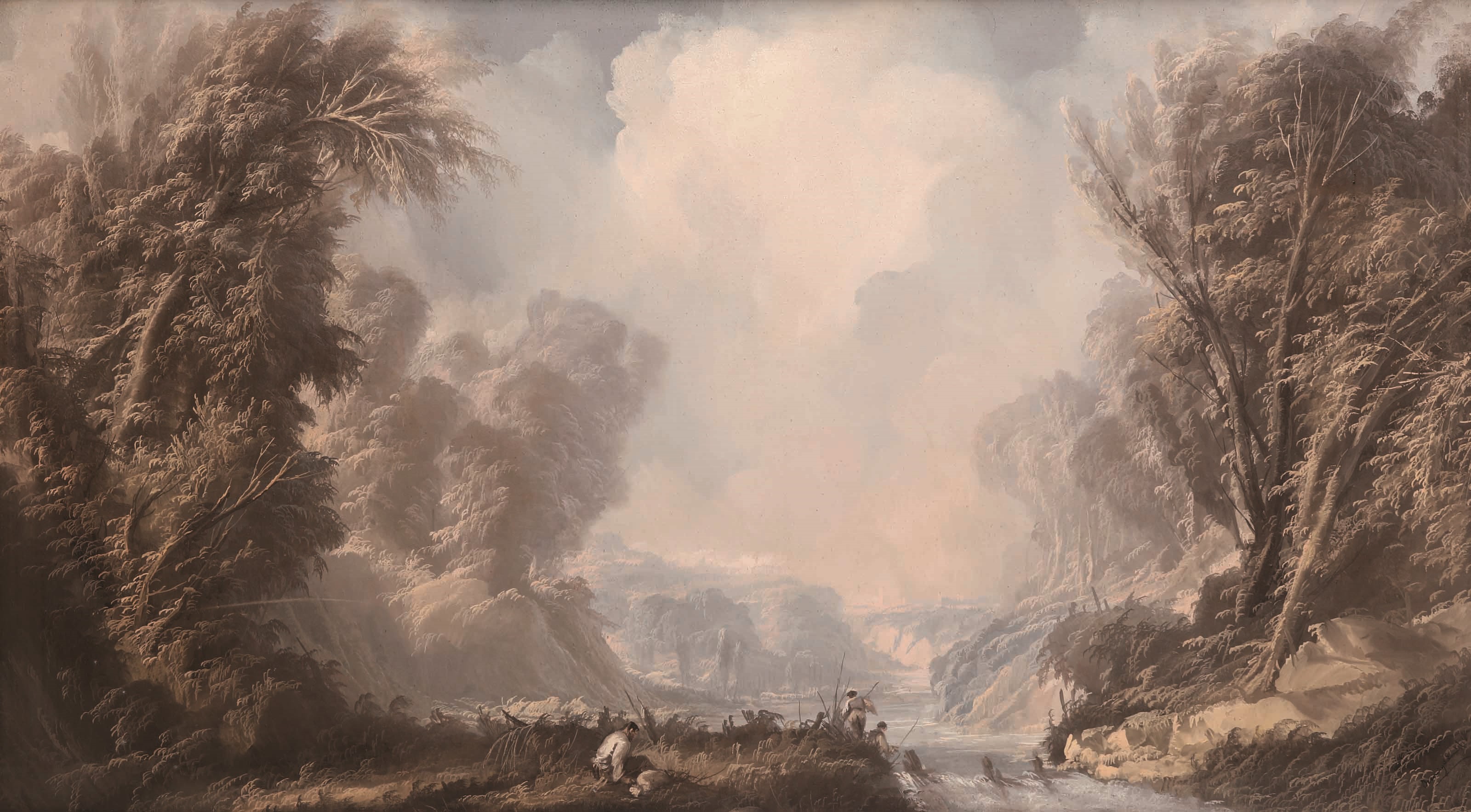 Paesaggio in stile settecentesco con pescatori in riva a un fiume