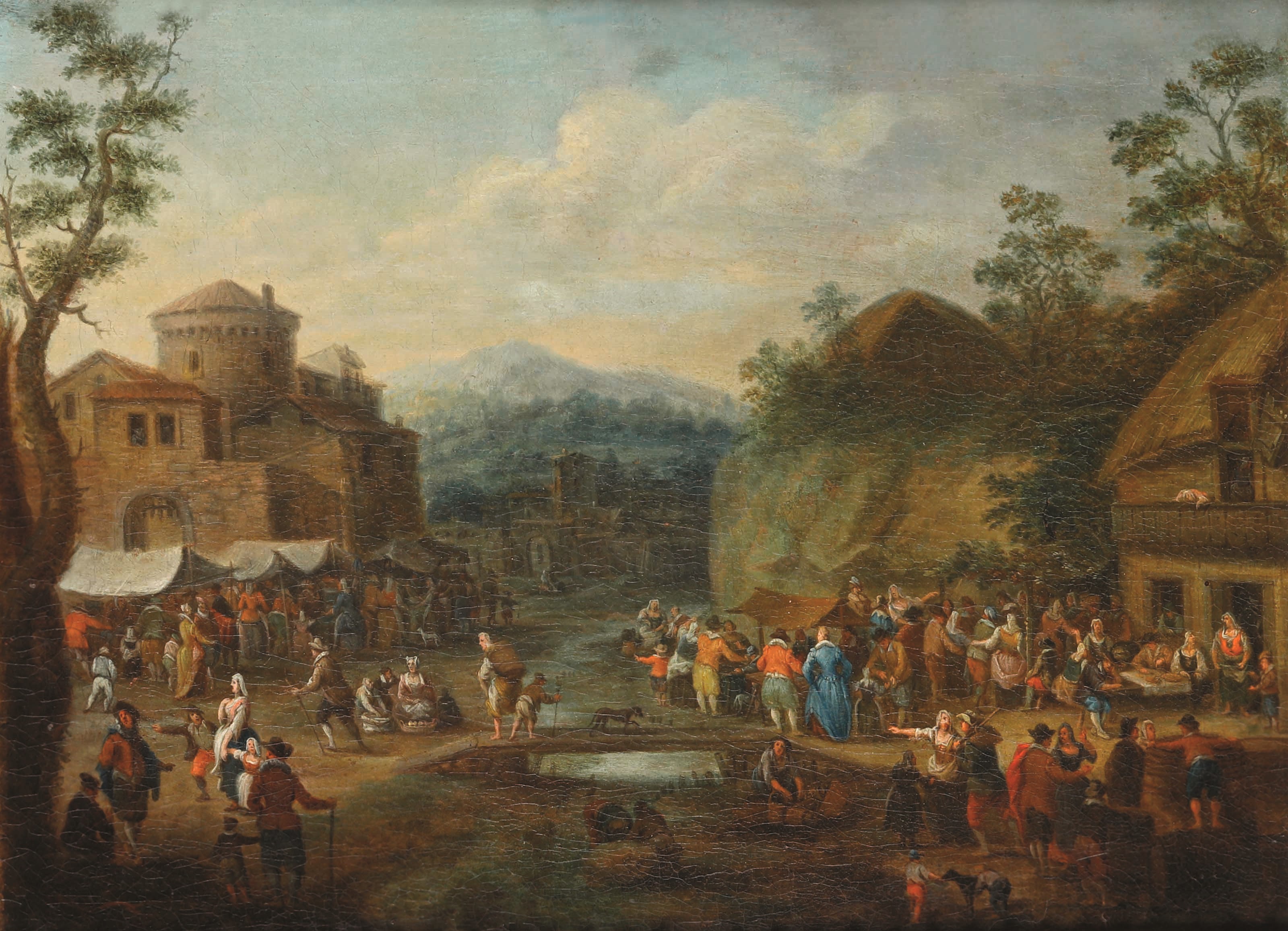 Scuola fiamminga del XVIII secolo Scene di genere con fiera di paese