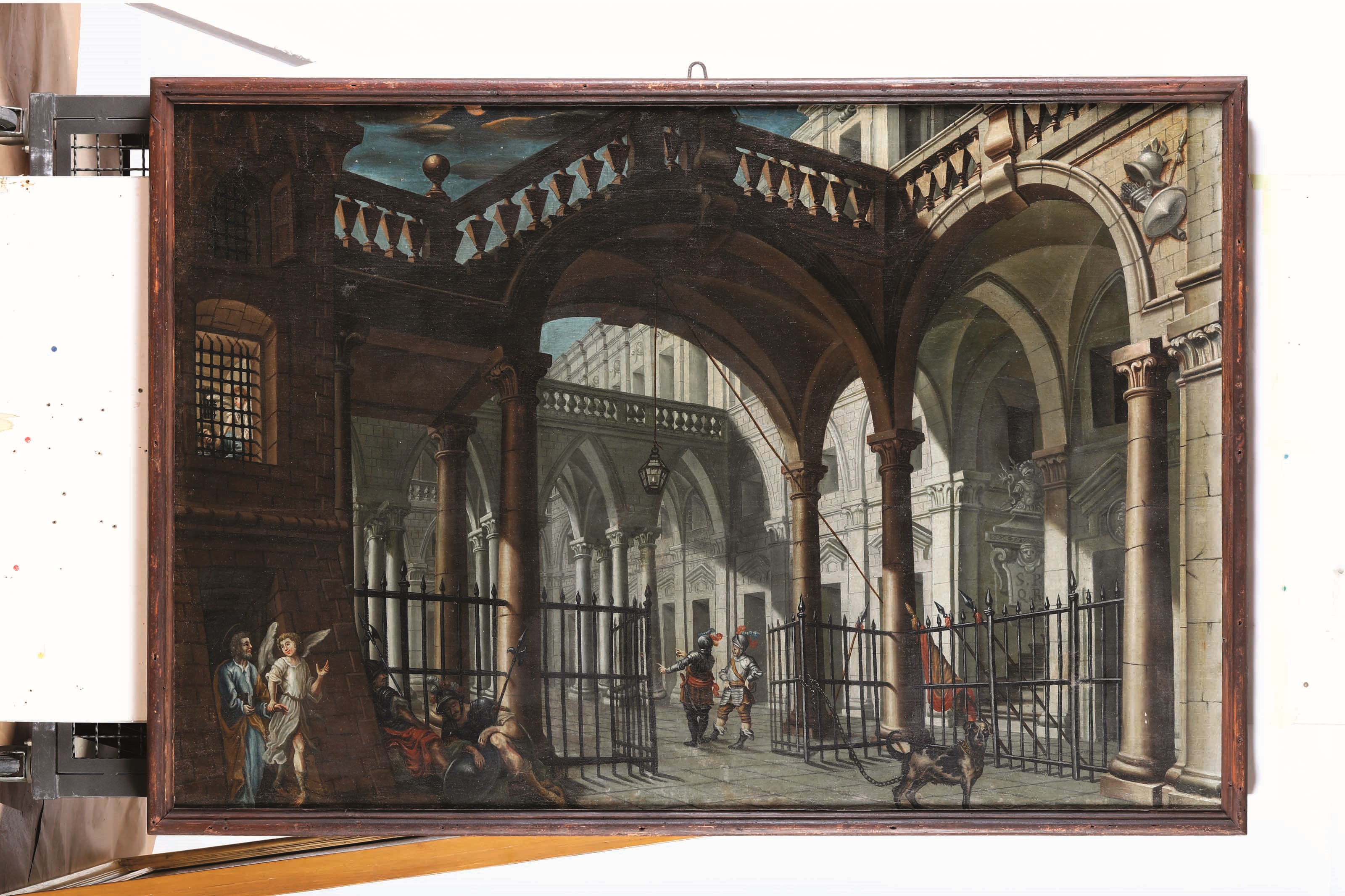 Scuola italiana del XVIII secolo Scorcio architettonico con la liberazione di San [..]