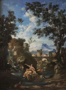 Angelo Visoni (XX secolo) Paesaggio in stile settecentesco con fanciulle al bagn [..]