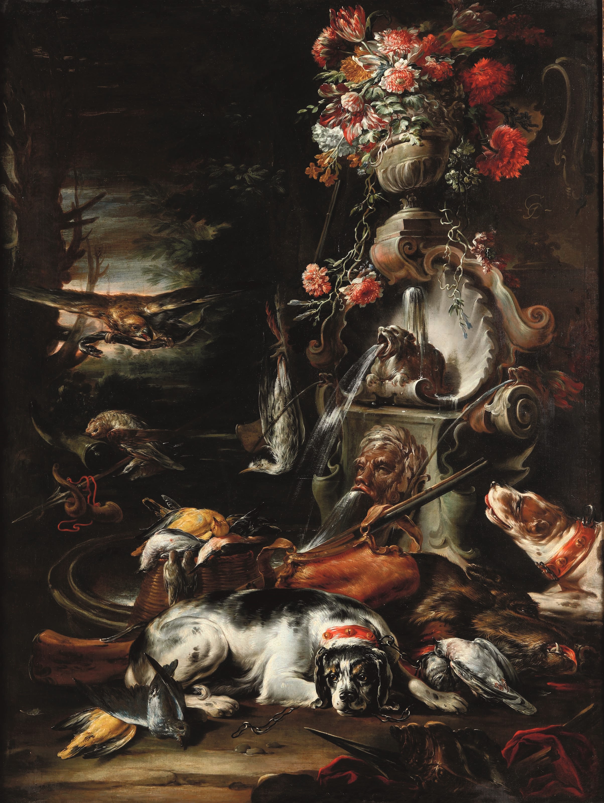 Natura morta con cacciagione su sfondo di giardino