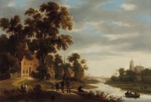 Scuola fiamminga del XVII secolo Paesaggio fluviale con pescatori e paesani
