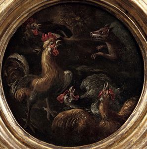 Scuola napoletana del XVIII secolo Natura morta con fiori, frutta, galli, pesci [..]