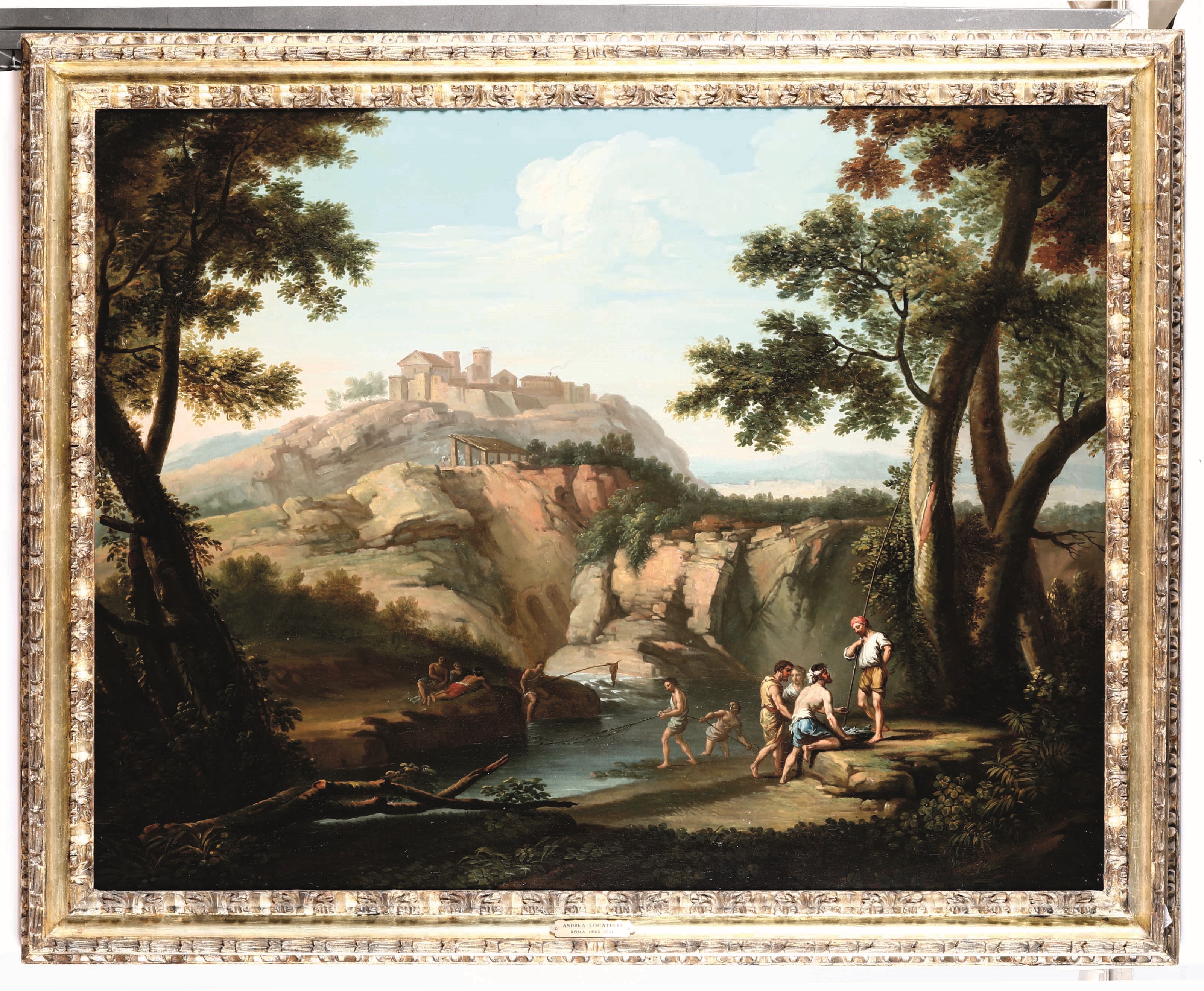 Paesaggio fluviale con personaggi e cittadella sullo sfondo