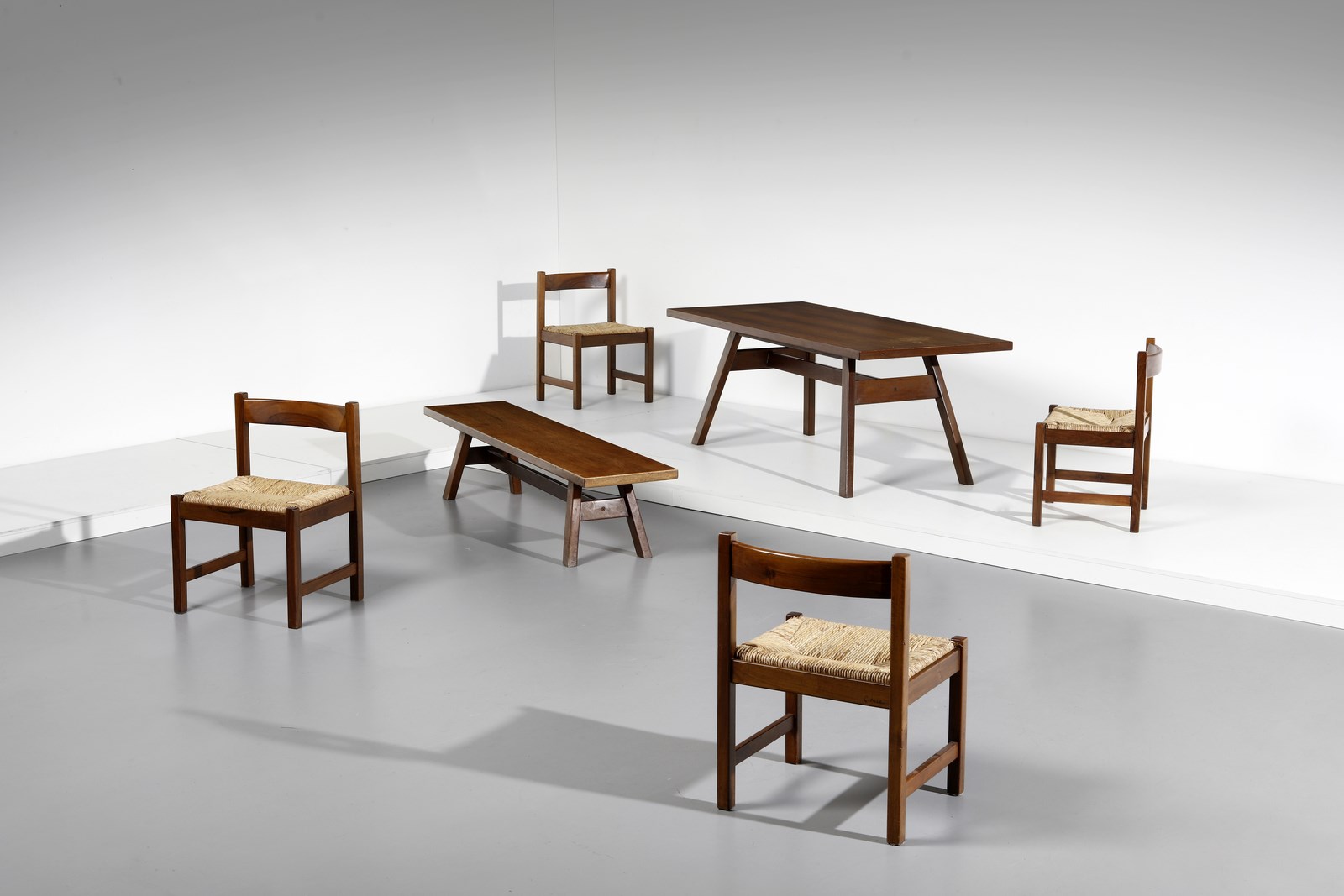 Bibliografia: Domus n. 426, maggio 1965, pagina pubblicitaria- Domus n. 434 , gennaio 1966, p. d/322 - Pier Carlo Santini, Facendo mobili con', Artigraf edizioni, Firenze, 1977, p. 75.Tavolo: 67 x 184 x 80 cmPanca: 40 x 184 x 40 cm