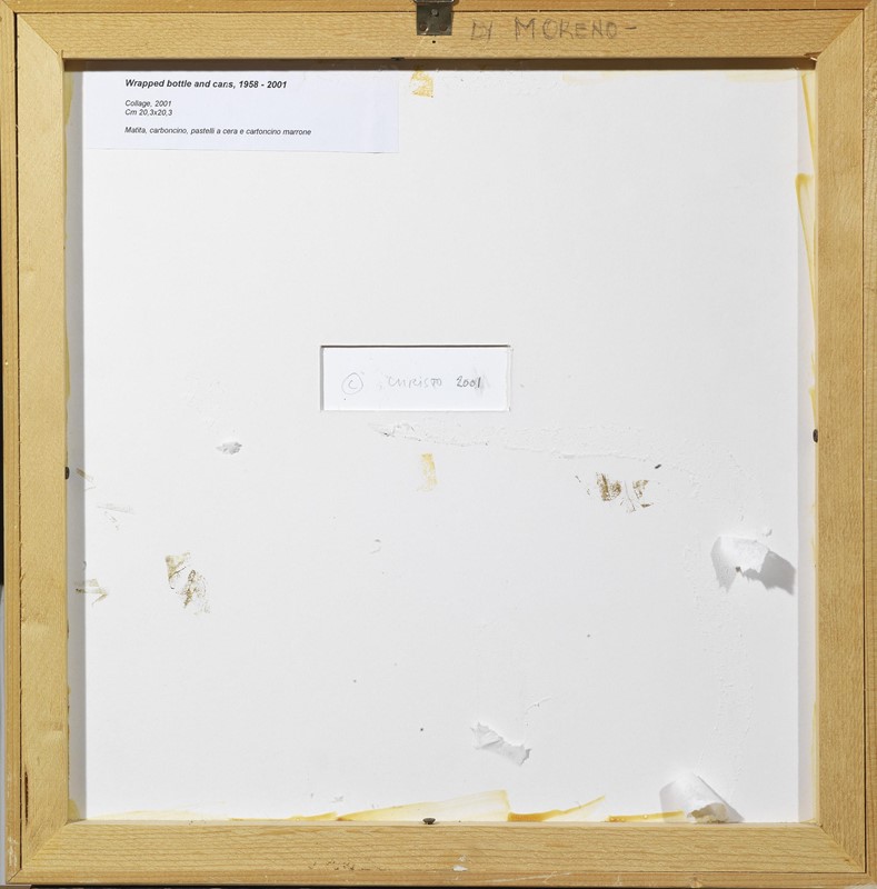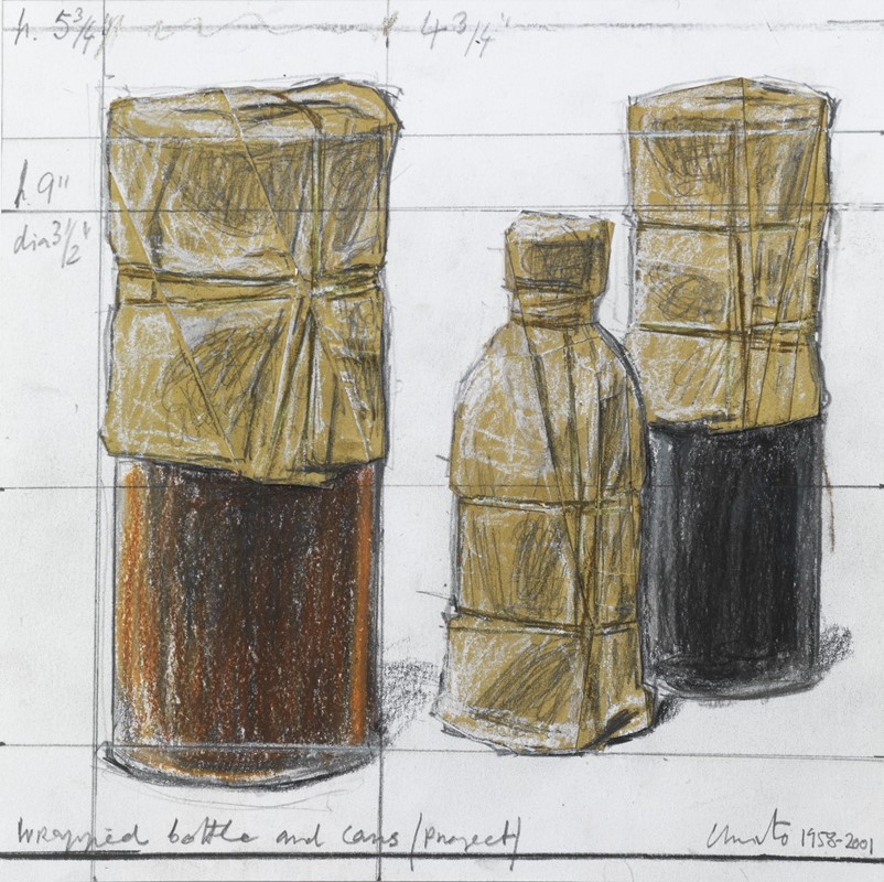 CHRISTO (Gabrovo 1935 - New York 2021) Wrapped bottles and cans 1958-2001 matita, carboncino, pastelli a cera e collage su cartoncino cm 20,3x20,3 firmato e datato in basso a destra titolato in basso a sinistra al retro firmato e datato