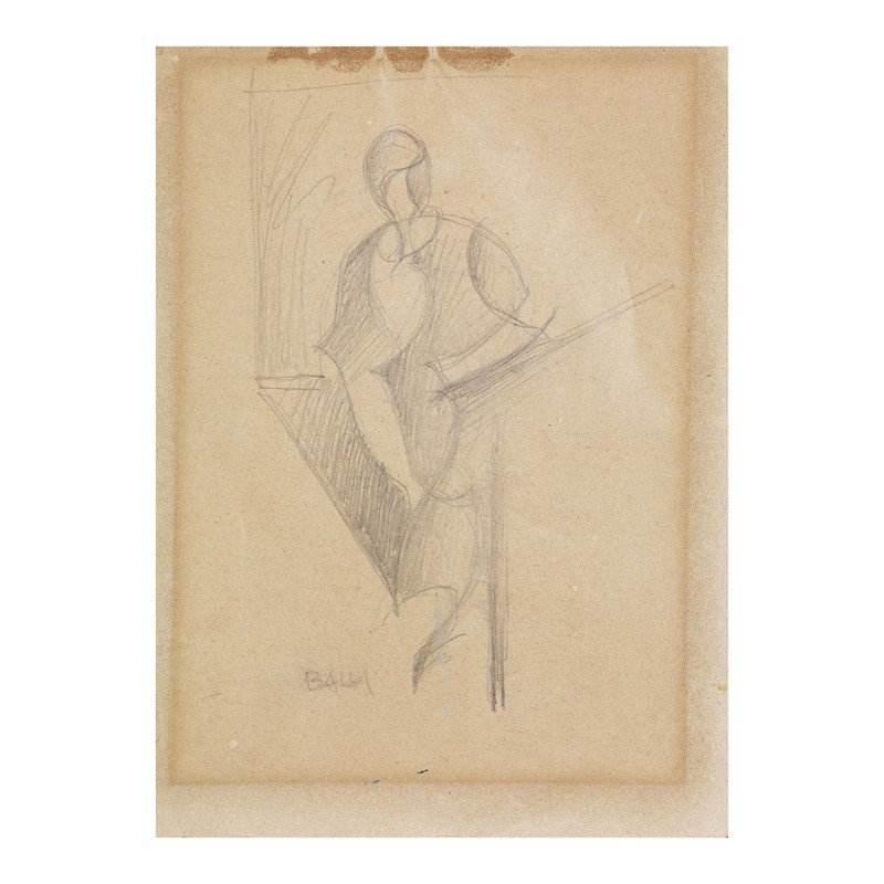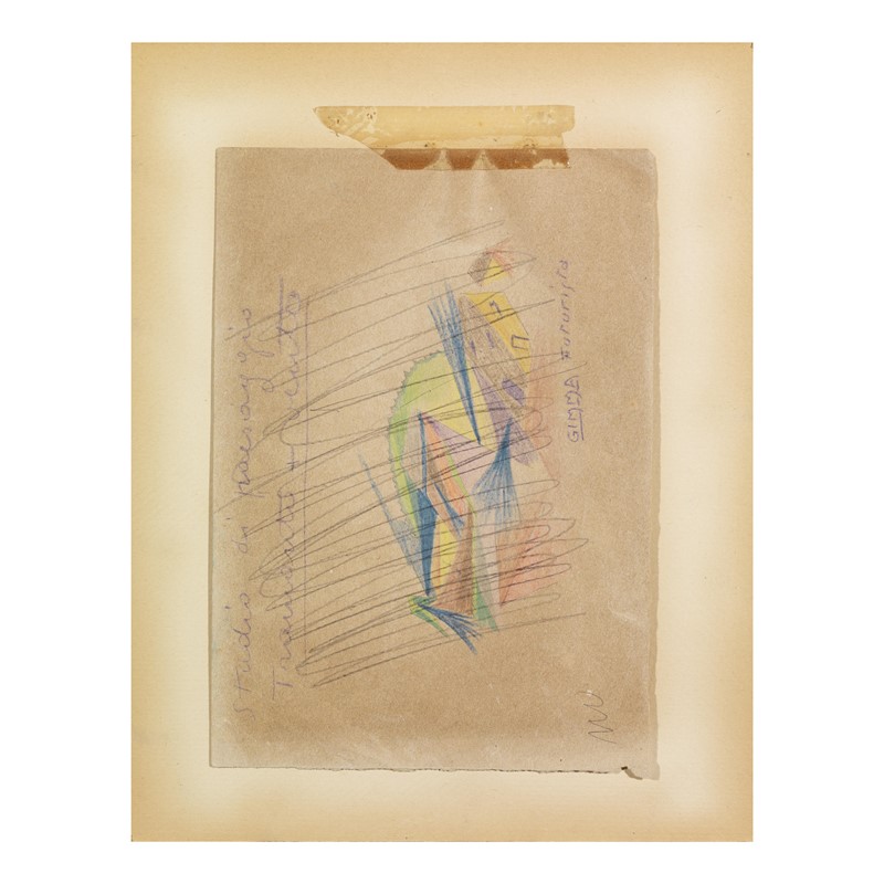 nel retro, sul cartone di chiusura targhetta ottagonale di Casa Balla e autentica di Luce Balla “Figura ambiente” 1919 disegno di Giacomo Balla