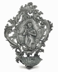 Acquasantiera con raffigurazione della Vergine Immacolata. Argento sbalzato, traforato [..]