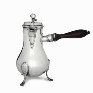 Caffettiera. Argento fuso, sbalzato e cesellato. Manico in legno ebanizzato. Lione [..]