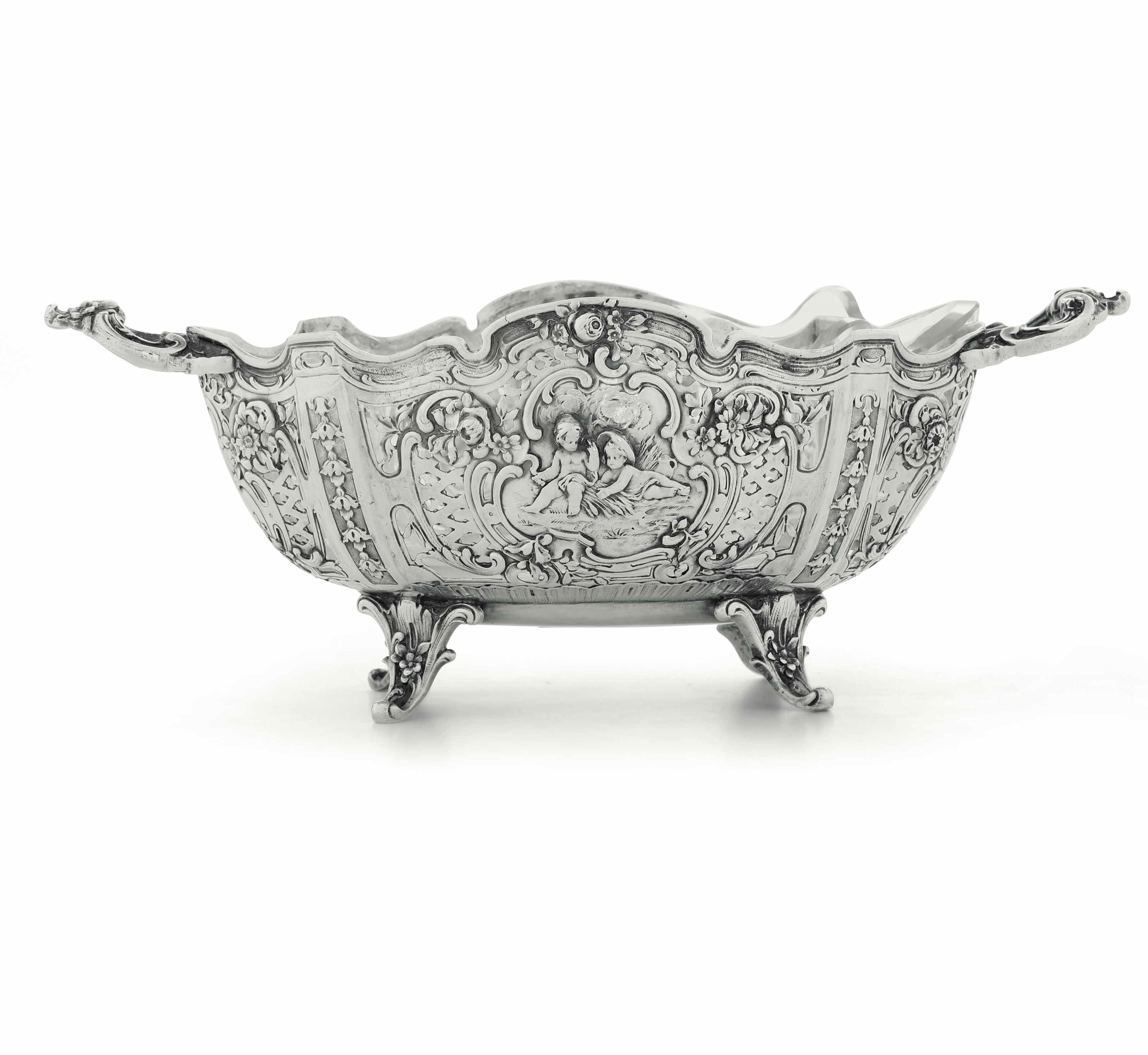 Centrotavola in argento fuso, sbalzato e cesellato. Germania XIX secolo.