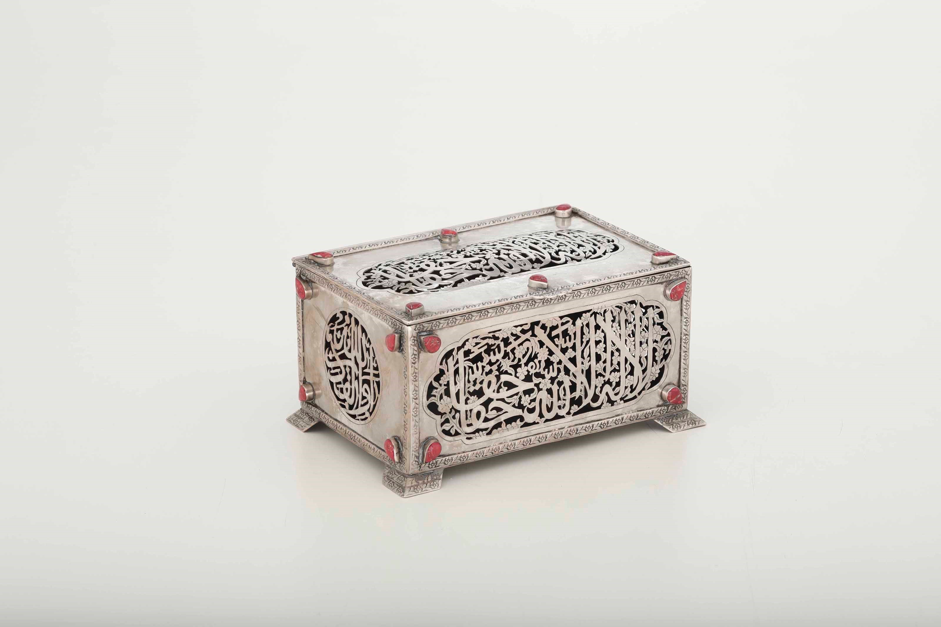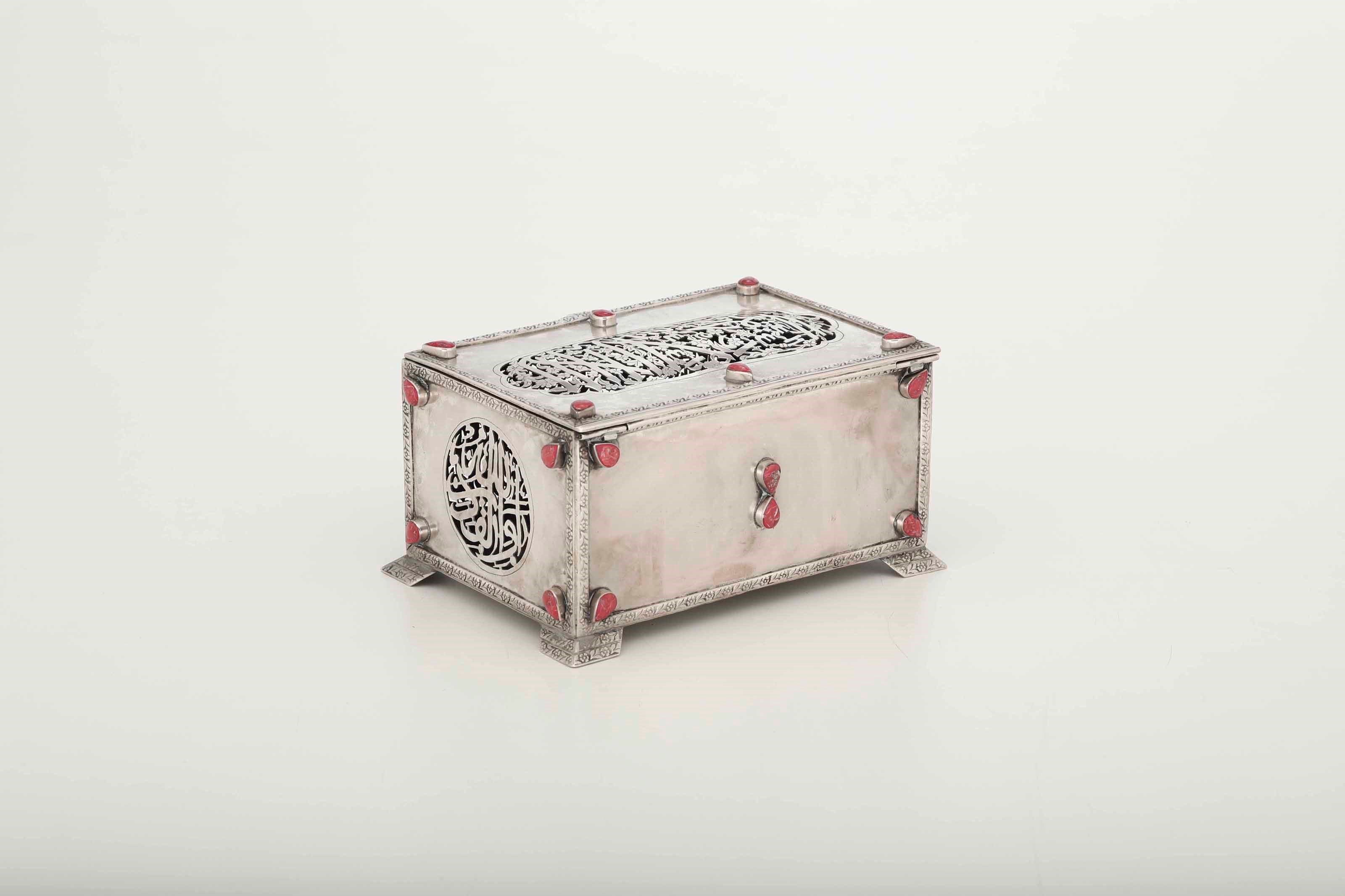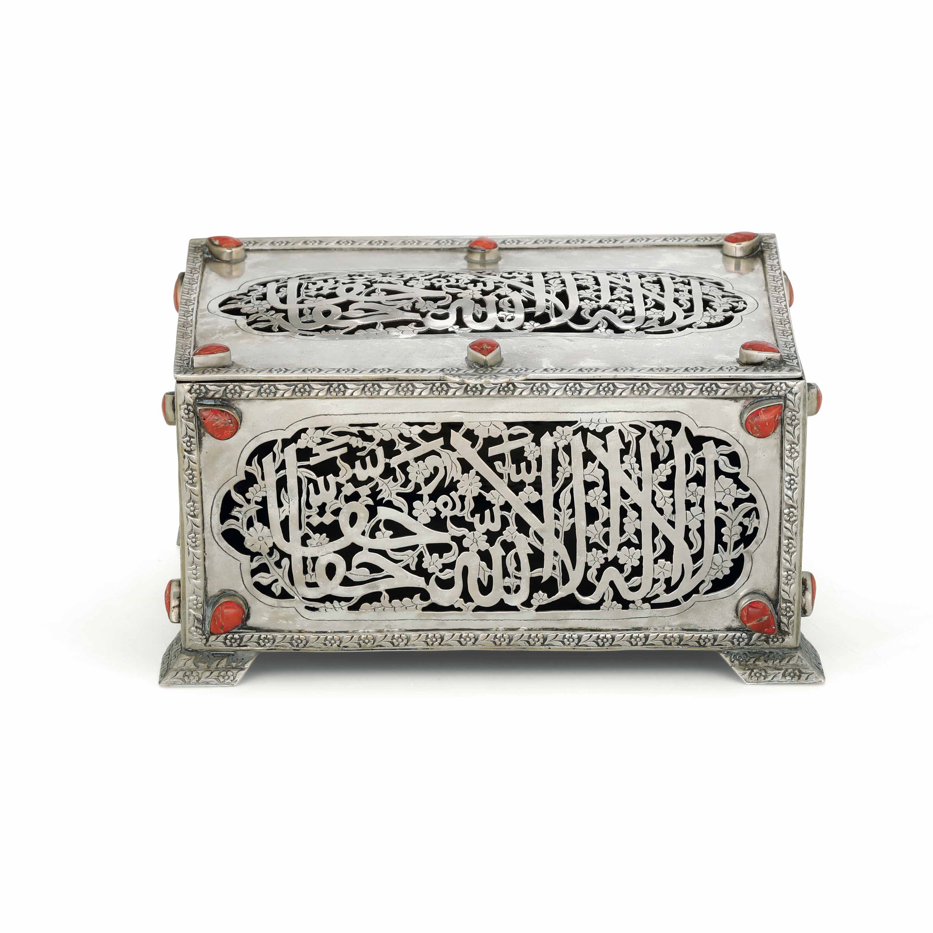 Cofanetto. Argento fuso, traforato e cesellato. Inserti a goccia in corallo. Manifattura [..]