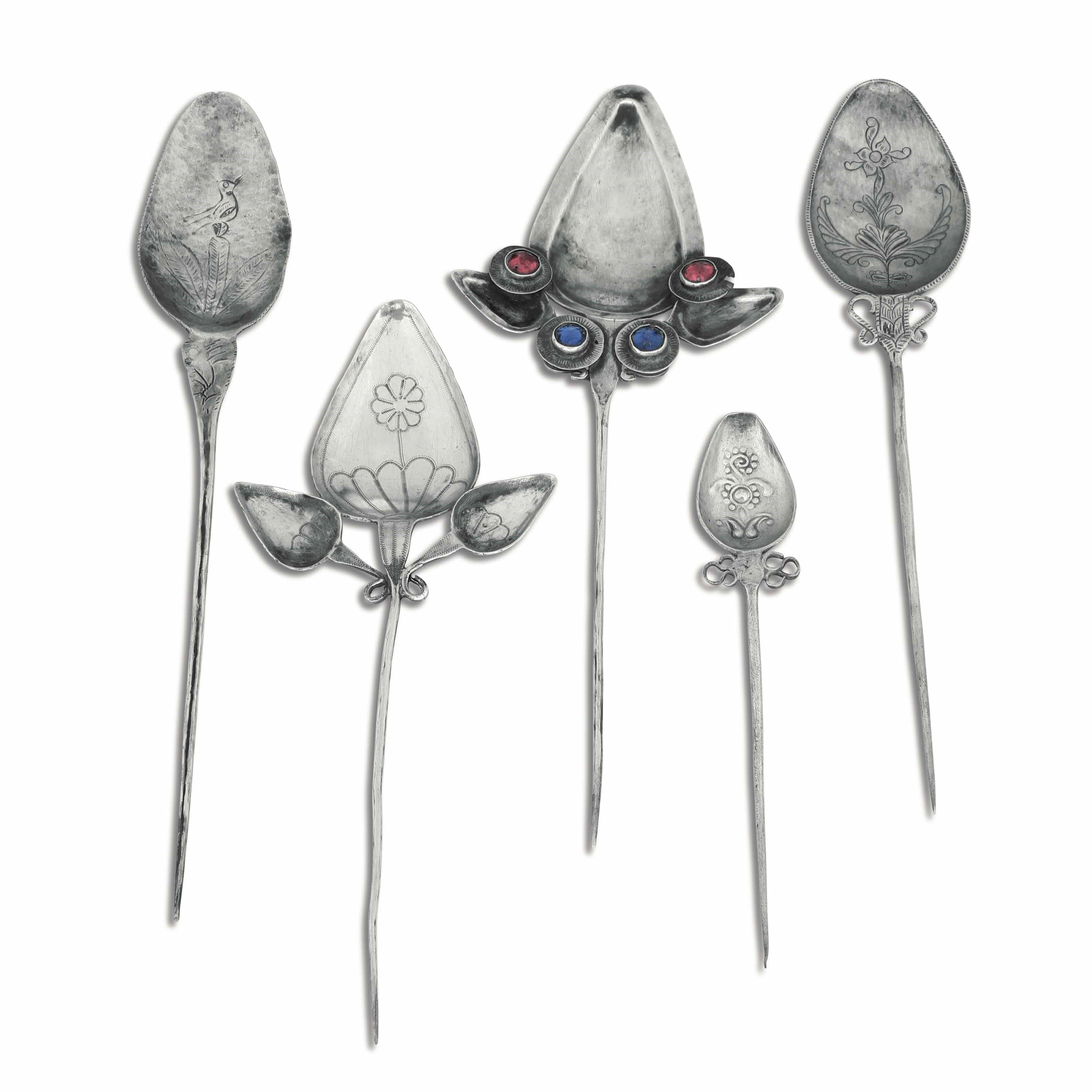 Gruppo di cinque spille (tupu). Argento sbalzato, traforato, cesellato e pietre [..]