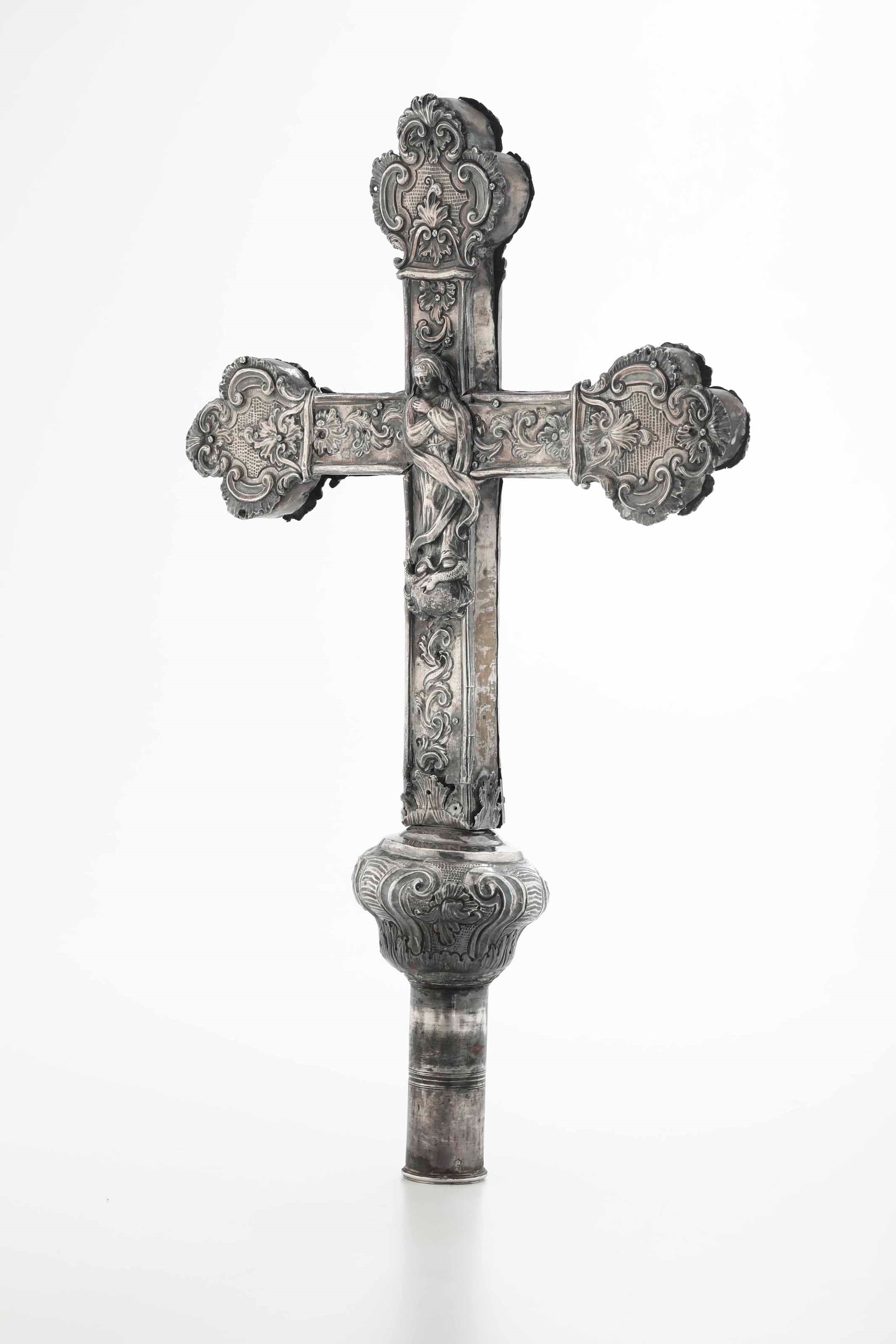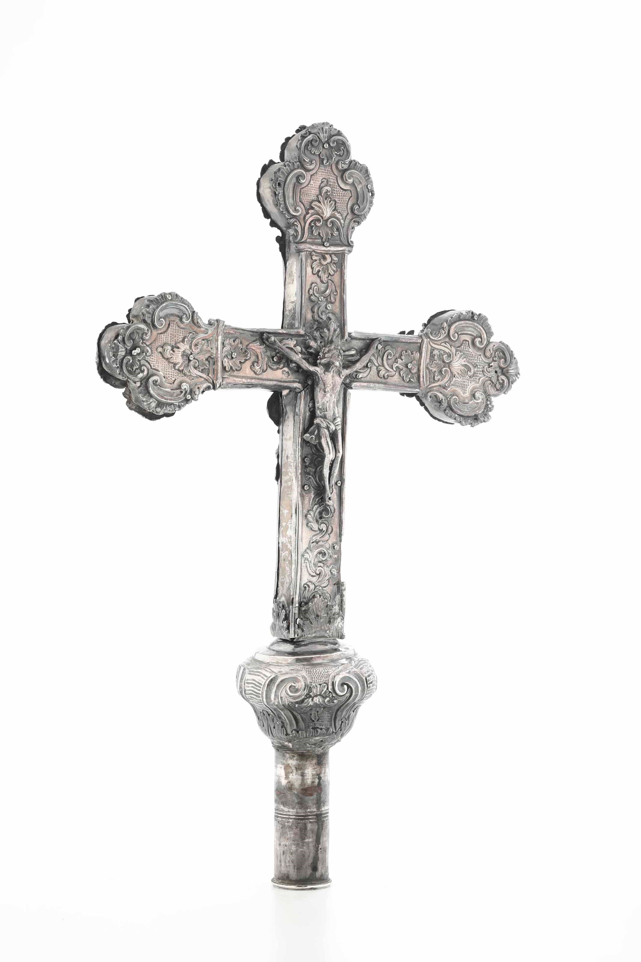 Importante croce processionale. Argento fuso, sbalzato e cesellato. Genova, marchio [..]