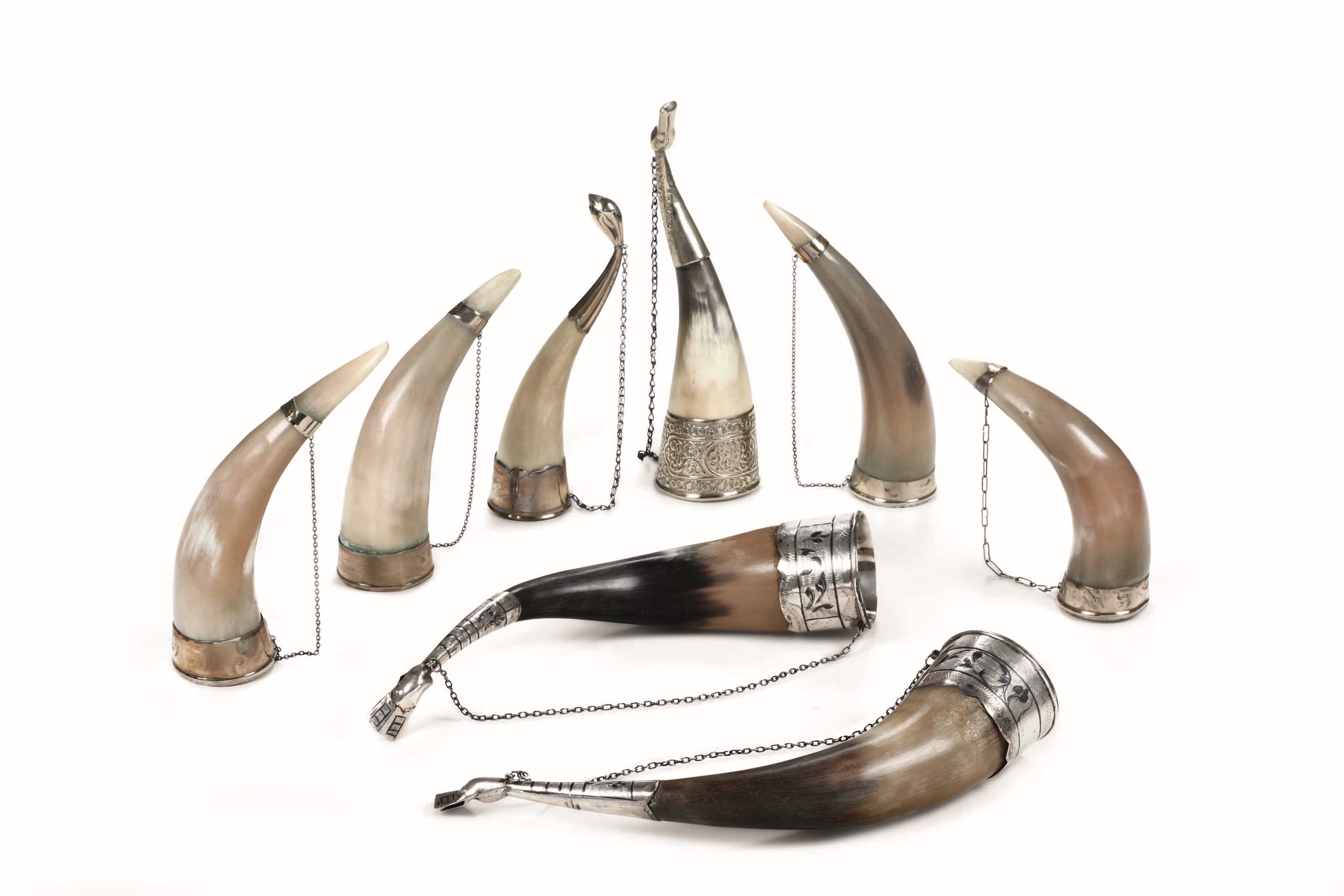 Insieme di otto corni potori Corno animale e finimenti in argento sagomato e ces [..]