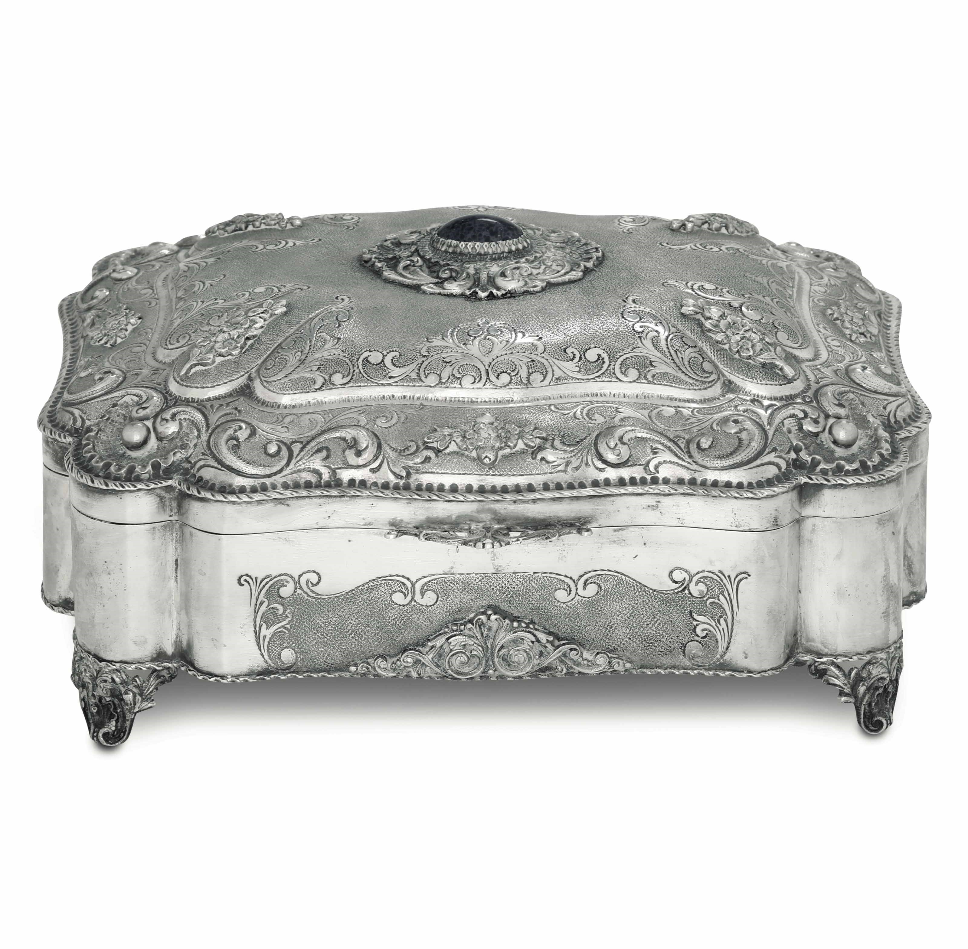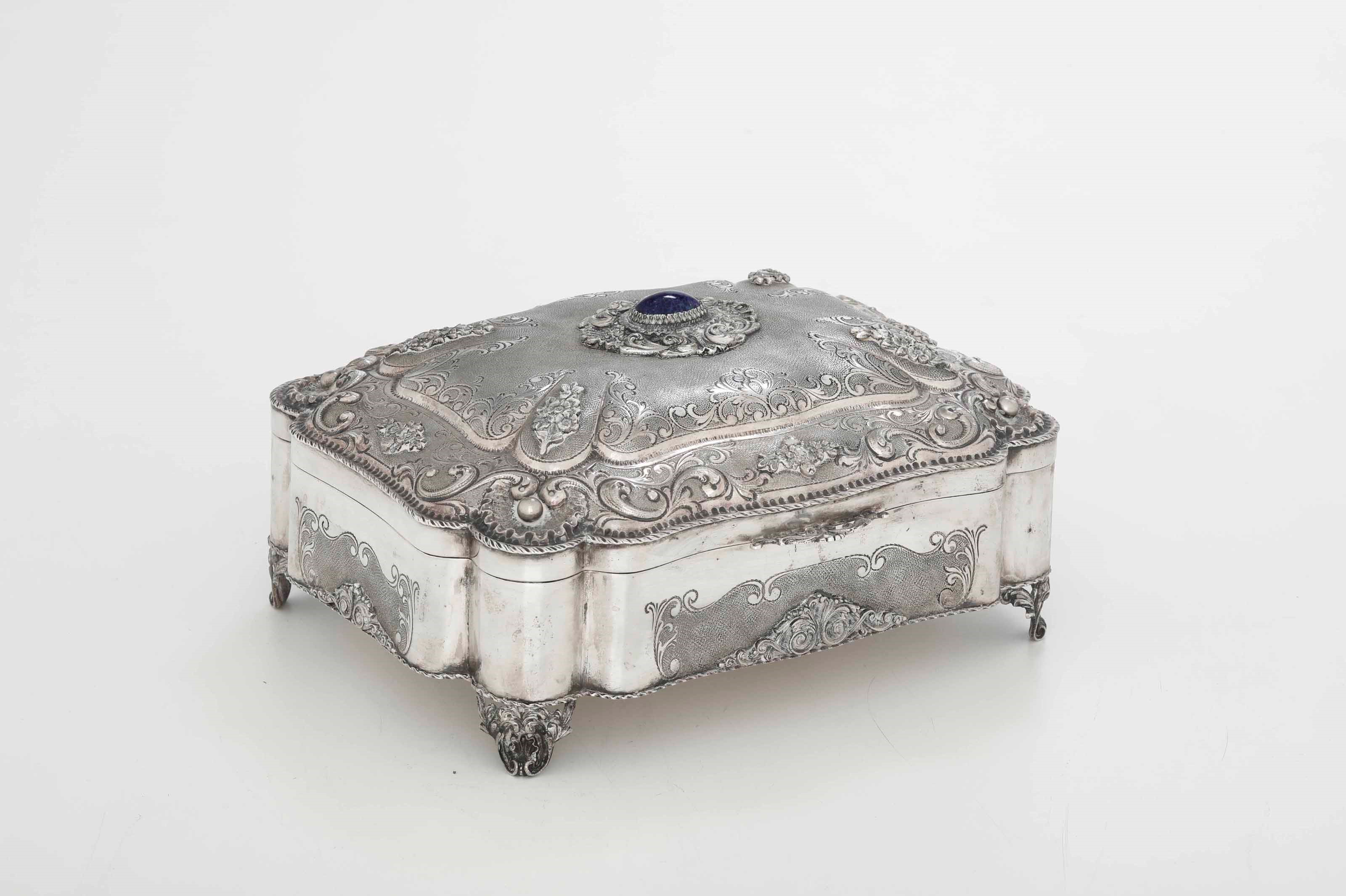 Portagioie. Argento fuso, sagomato e cesellato, castone con pietra blu cabochon. [..]
