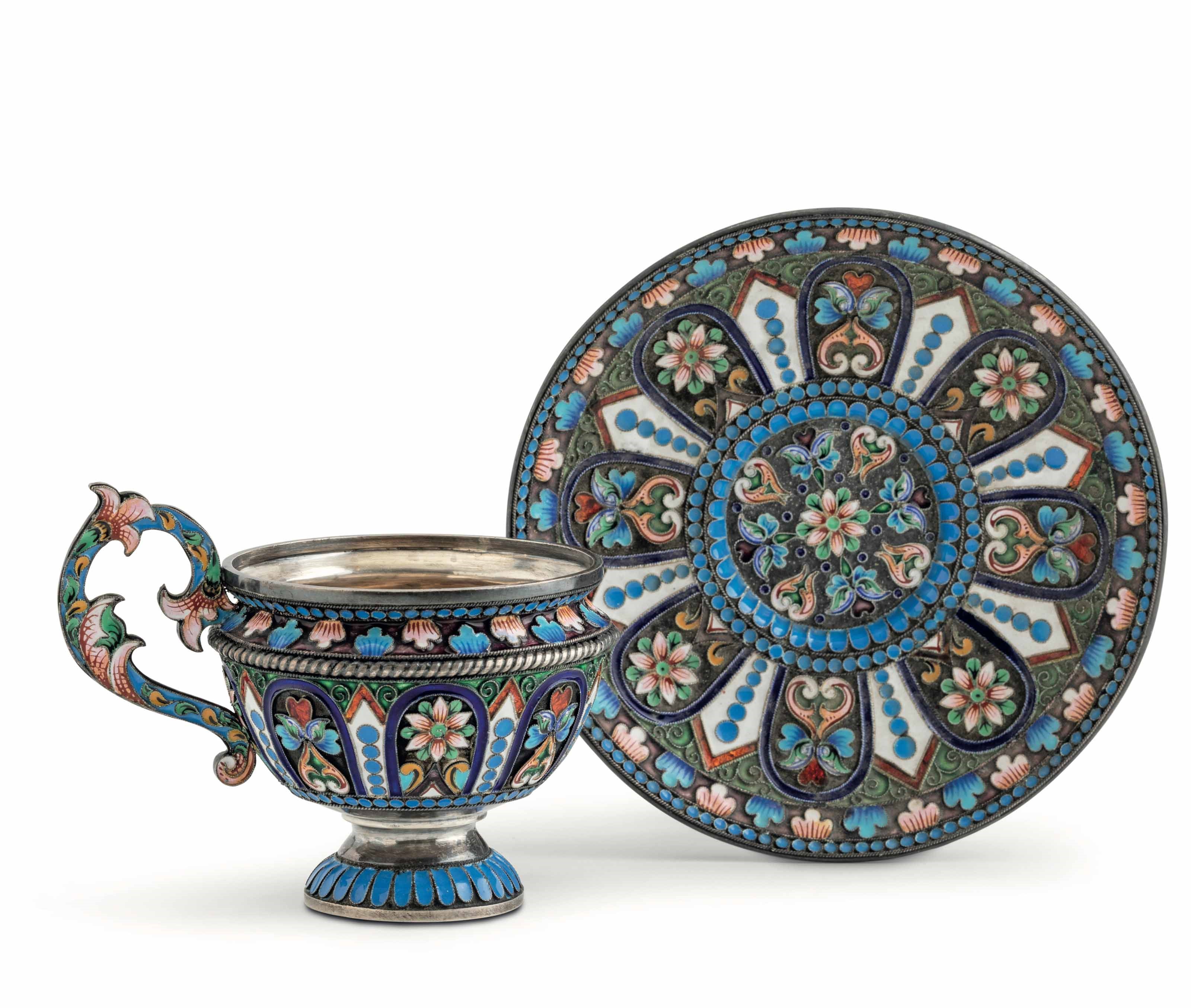 Tazza e piattino. Argento e smalti colorati. Manifattura russa del XX secolo