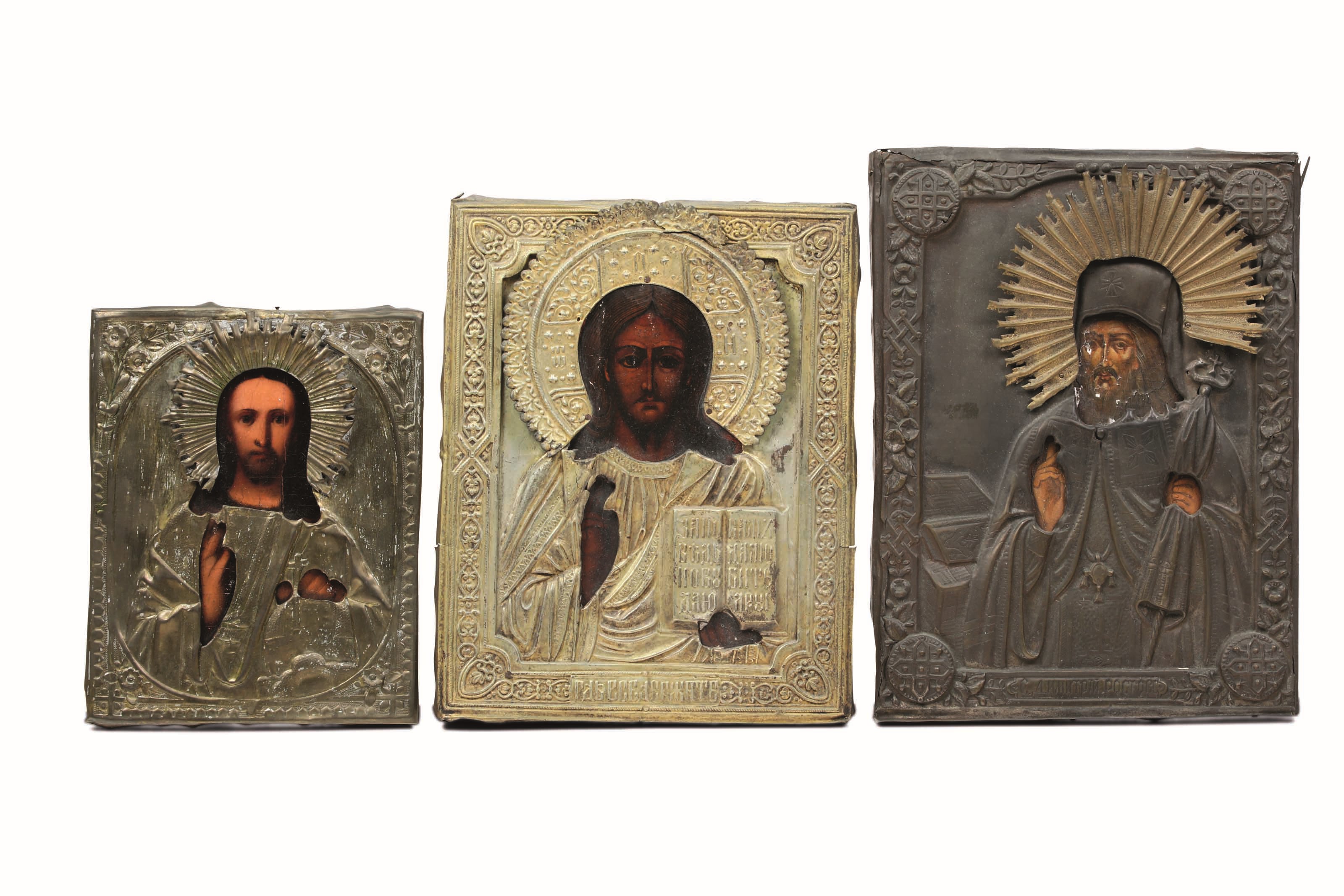 Tre icone. Riza in metallo argentato e dorato. Scuola russa del XIX-XX secolo Cristo [..]