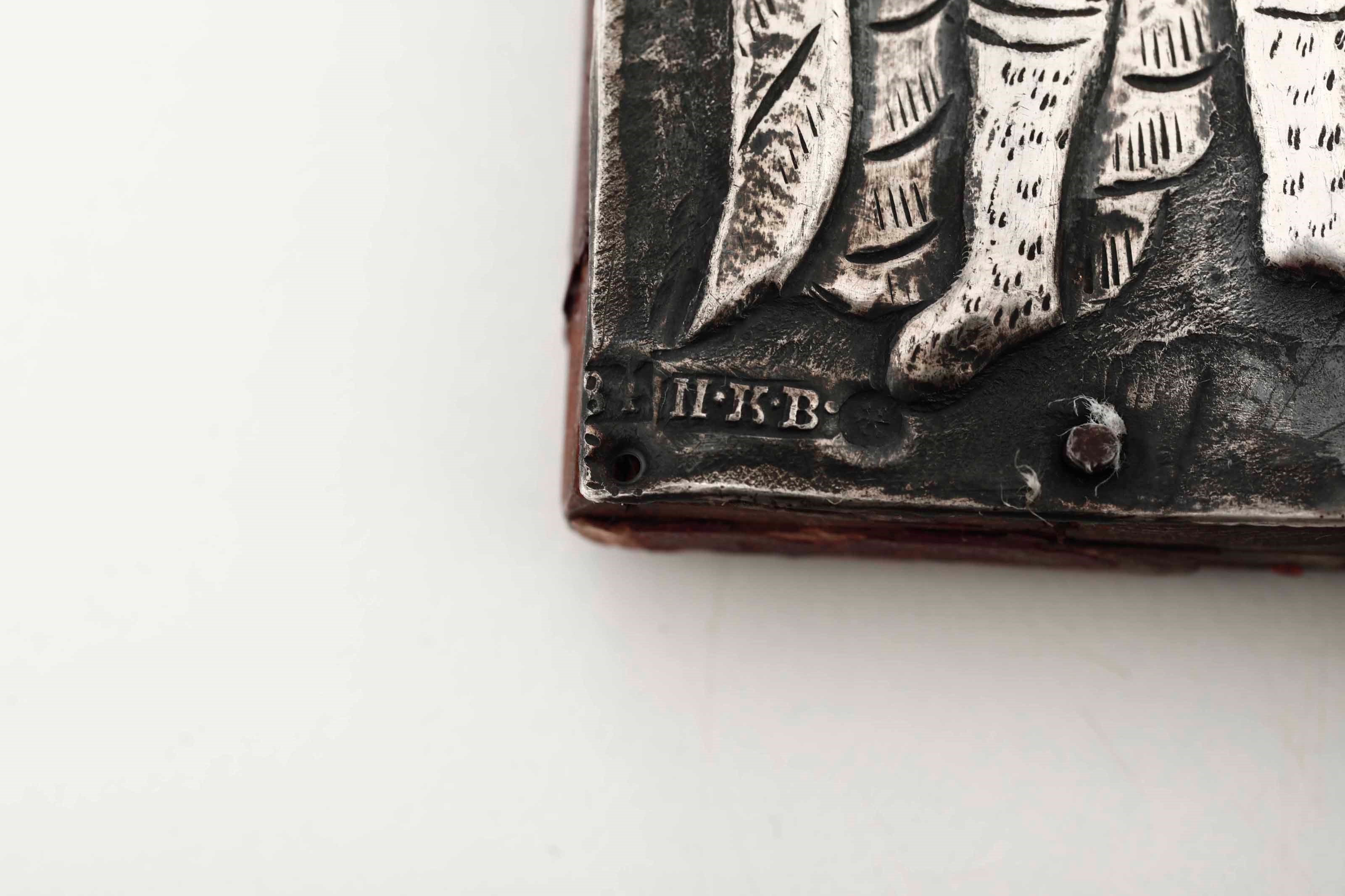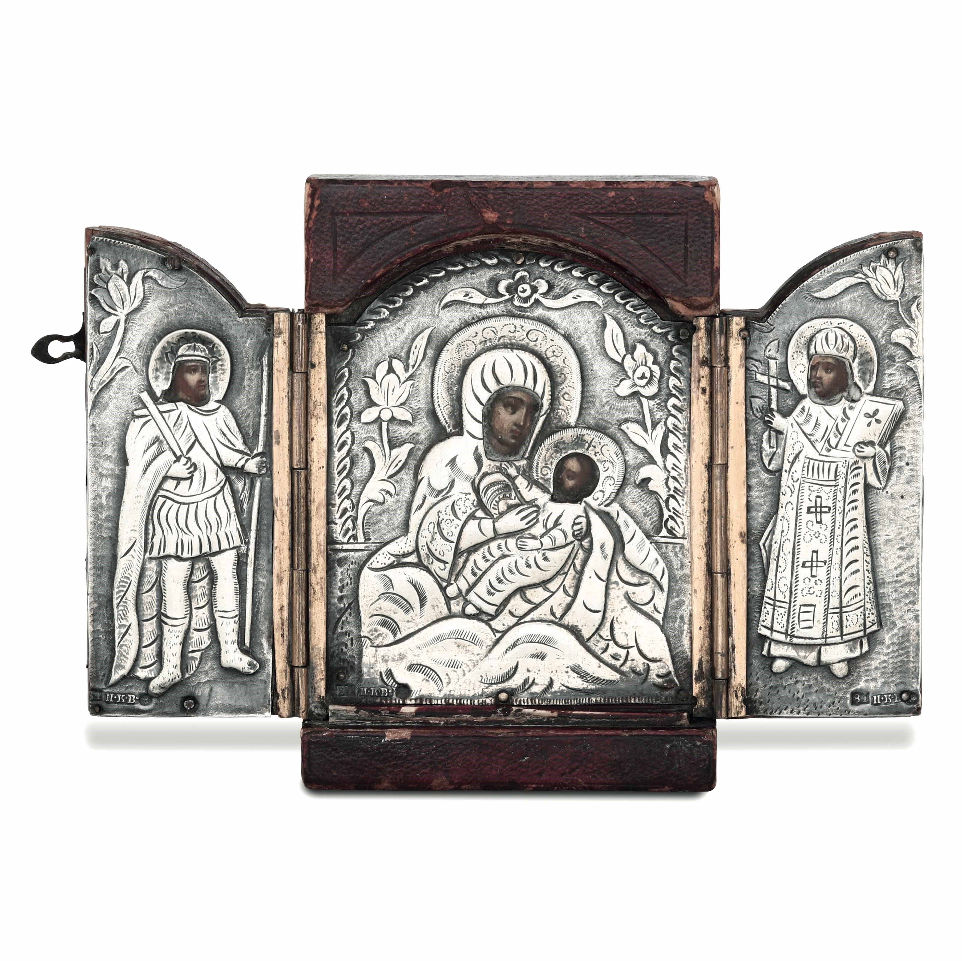 Trittico con Madonna e Santi. Icona su legno e riza in argento sbalzato, traforato [..]