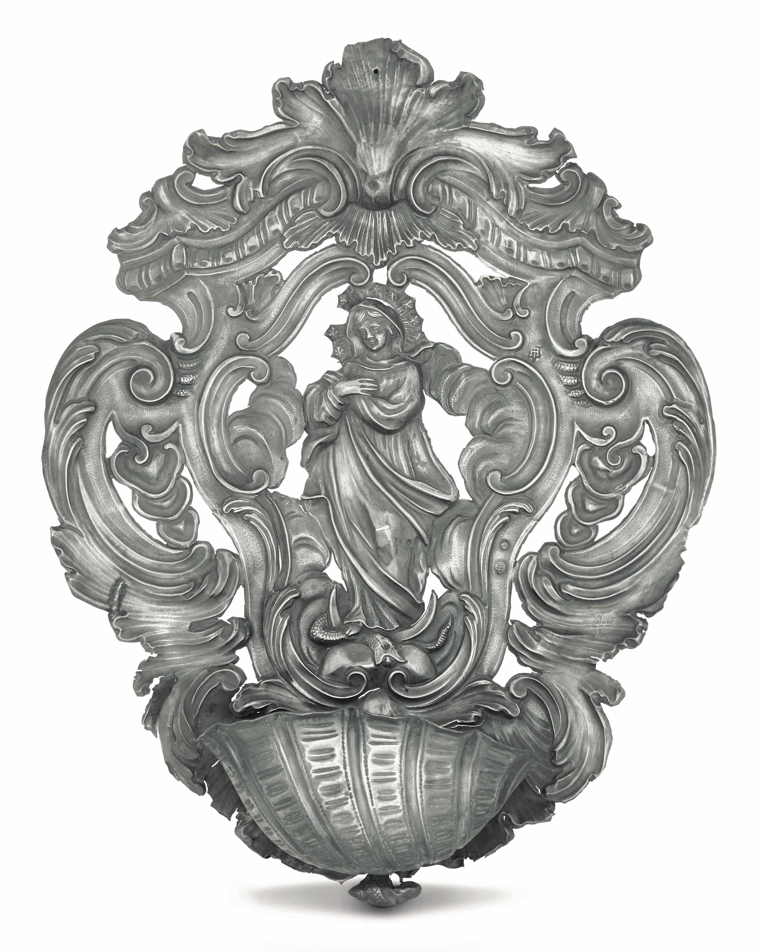 Acquasantiera con raffigurazione della Vergine Immacolata. Argento sbalzato, traforato [..]