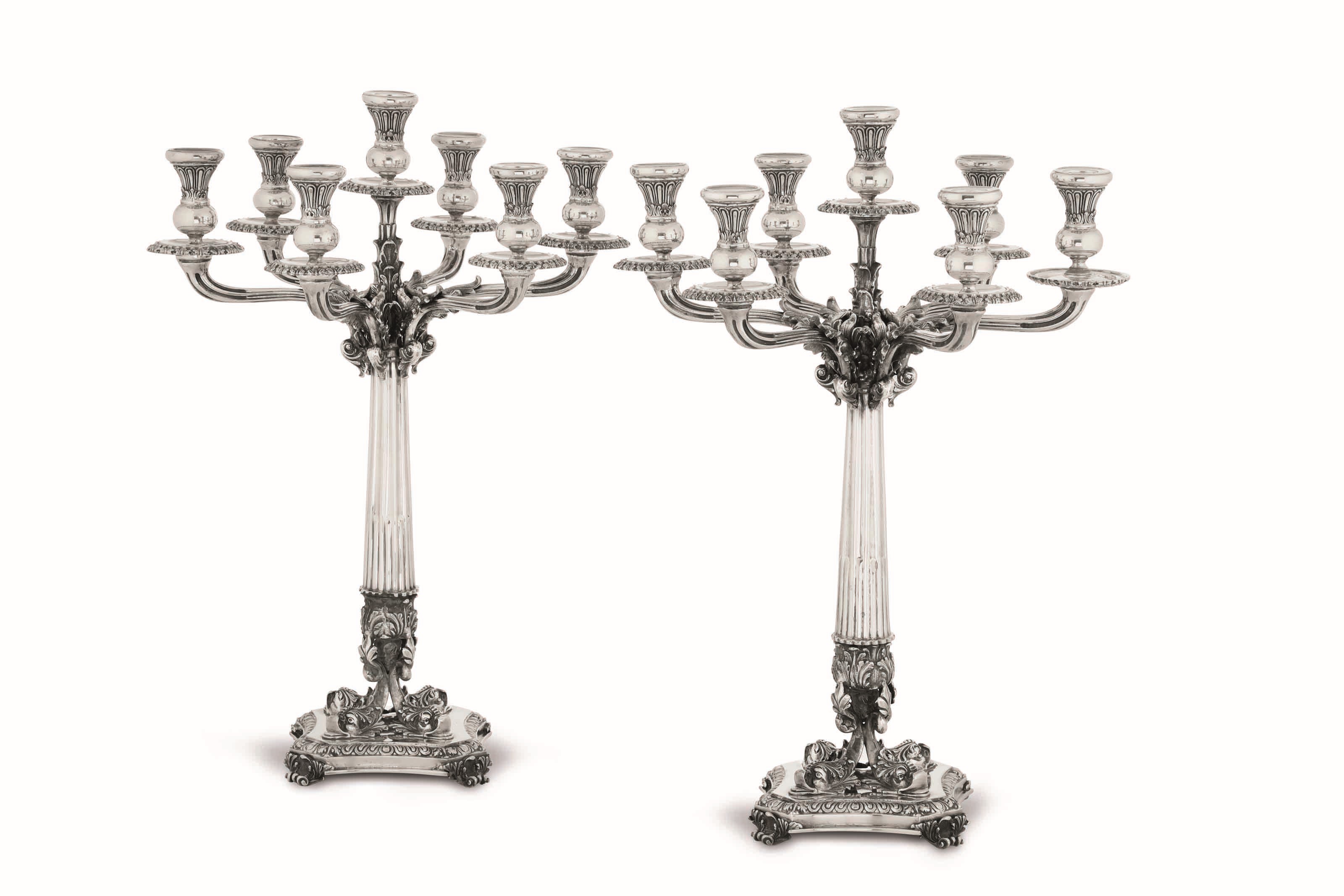 Coppia di candelabri a sette fiamme. Argento fuso, sagomato e cesellato. Argenteria [..]