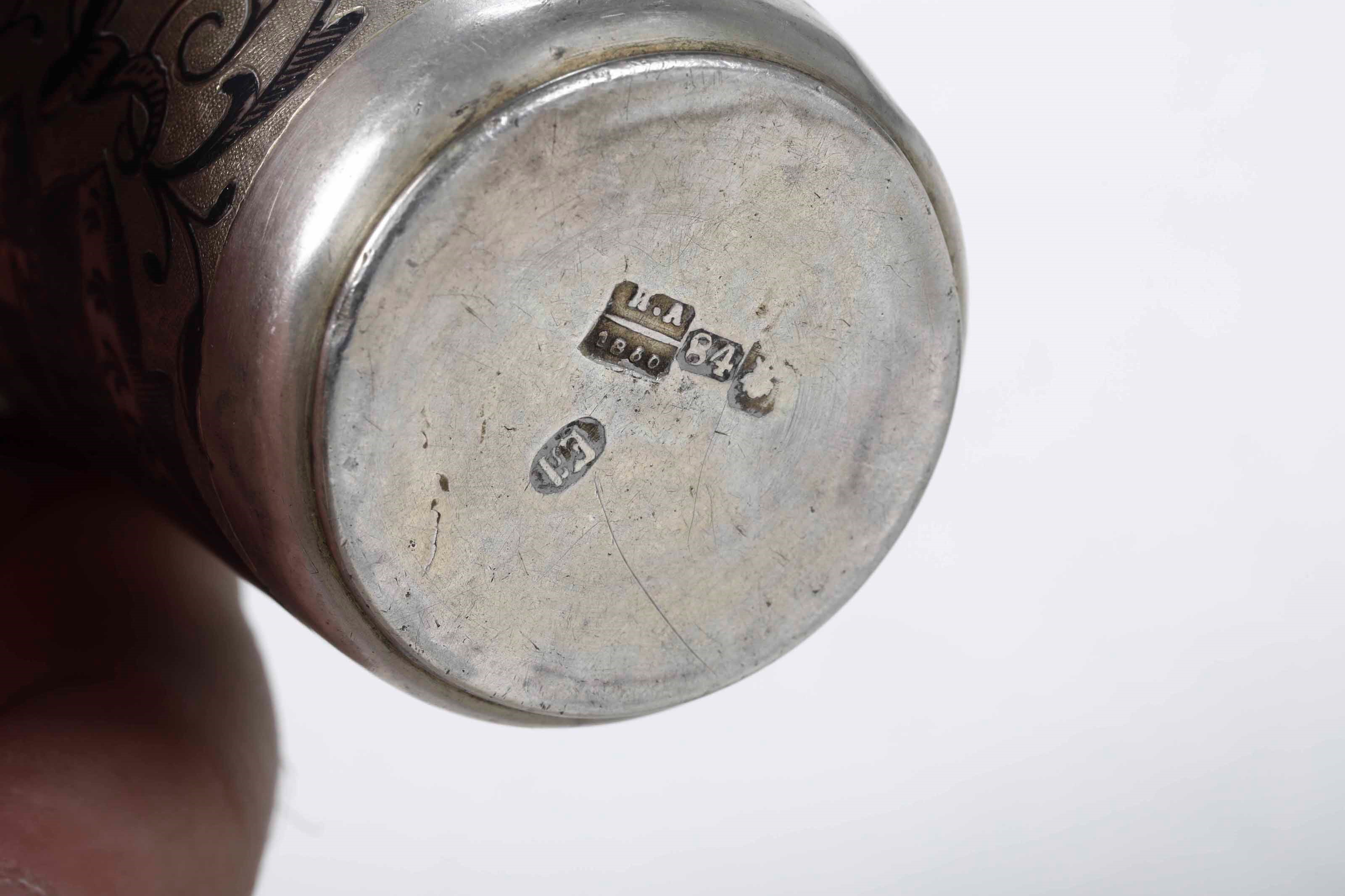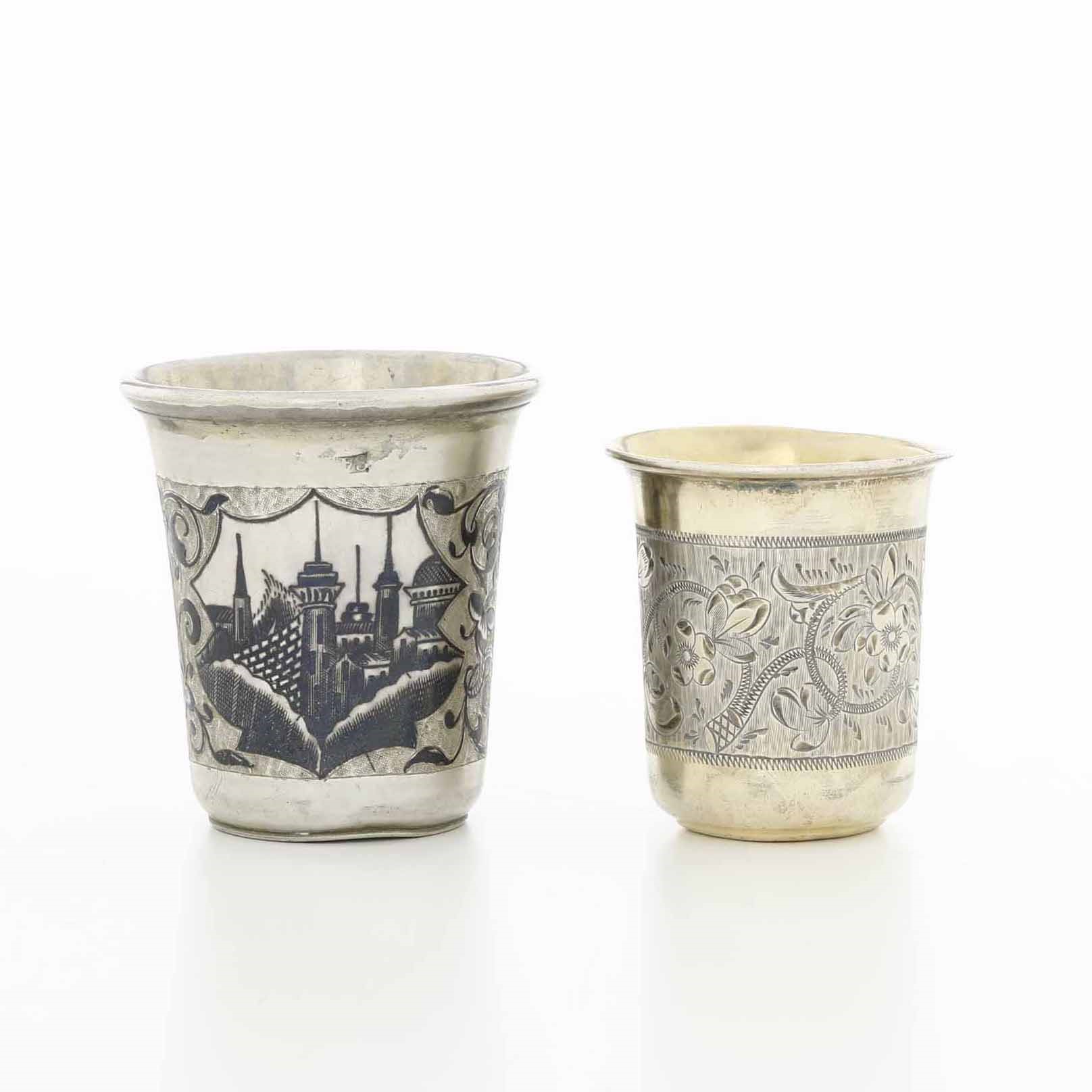 Due bicchieri. Argento sbalzato, cesellato, dorato e niellato. Uno Mosca 1872, assaggiatore [..]