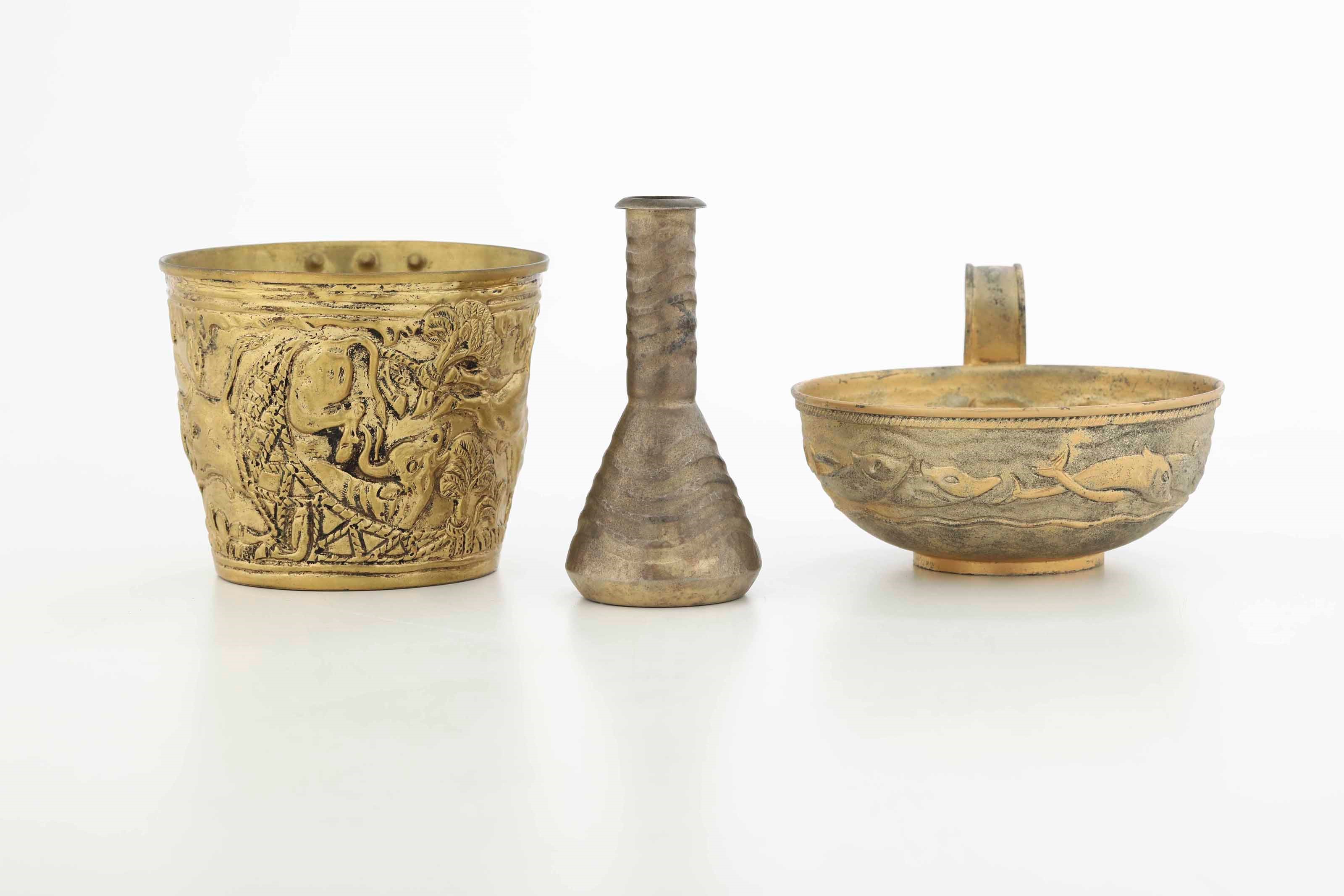 Due coppe e ampolla stile archeologico. Argento fuso, sbalzato, cesellato e dorato. [..]