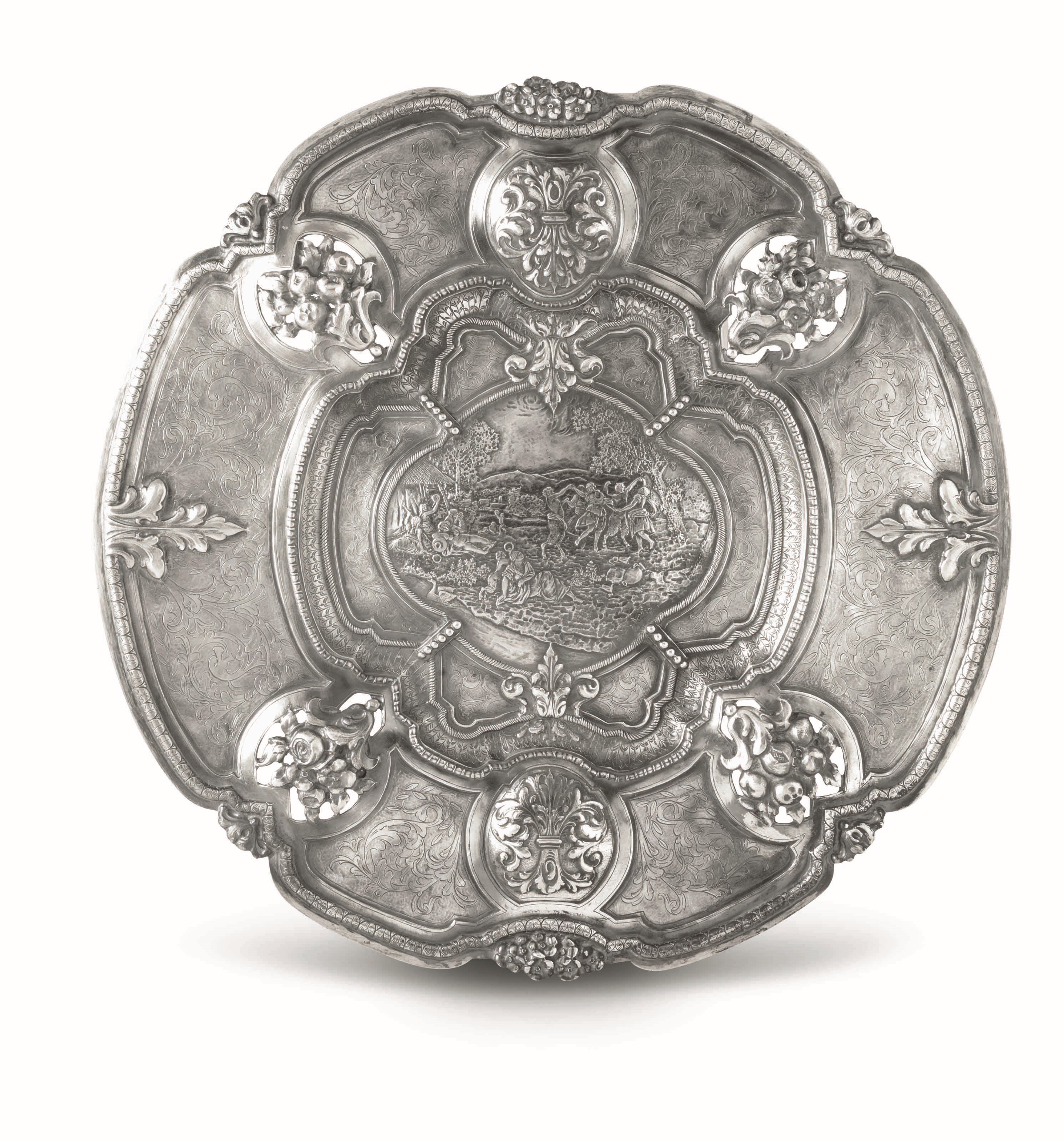 Grande piatto da parata circolare sagomato. Argento fuso,sbalzato e finemente cesellato. [..]