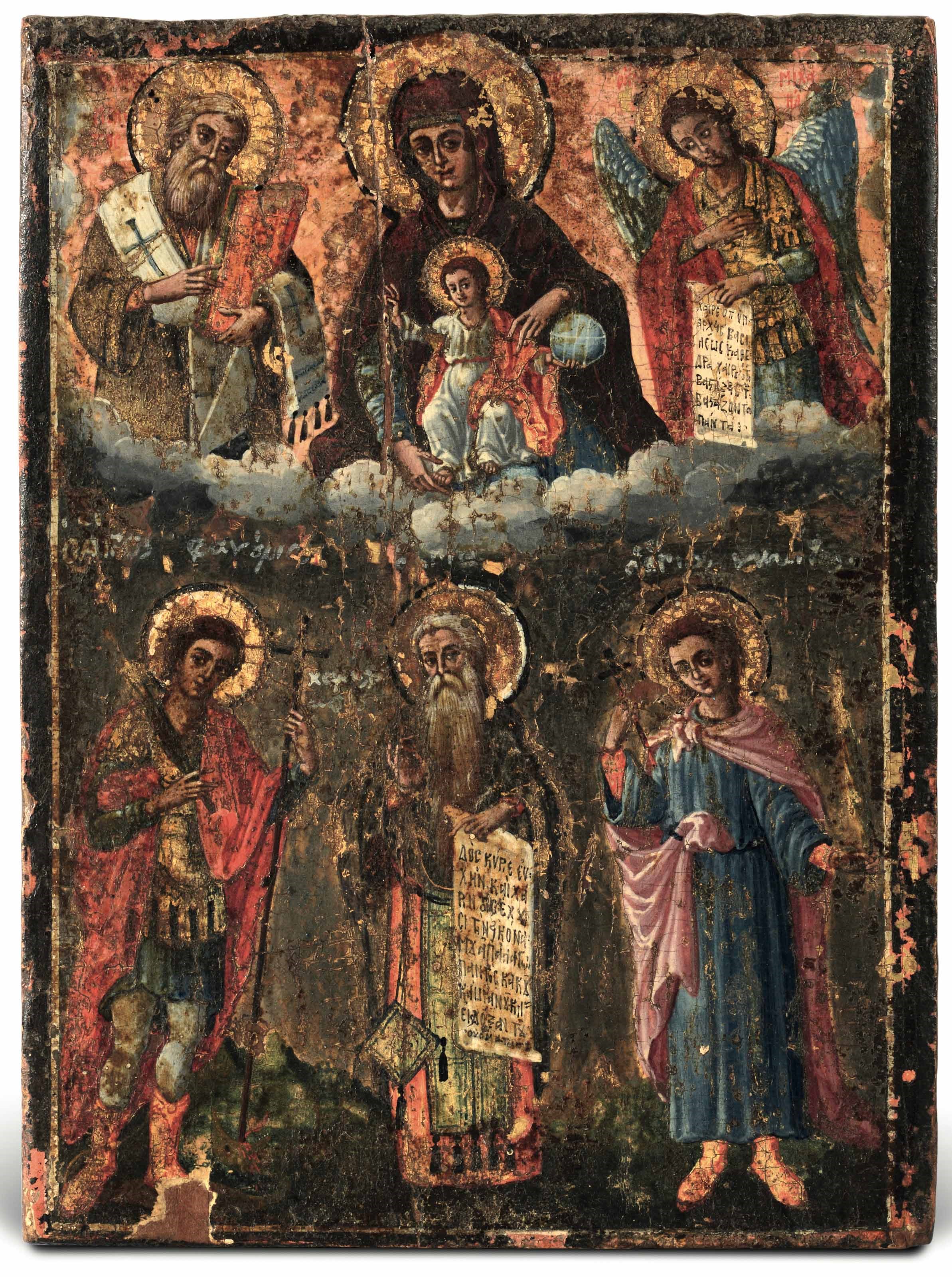 Icona tempera su tavola. Scuola russa del XIX secolo Madonna con Bambino e Santi