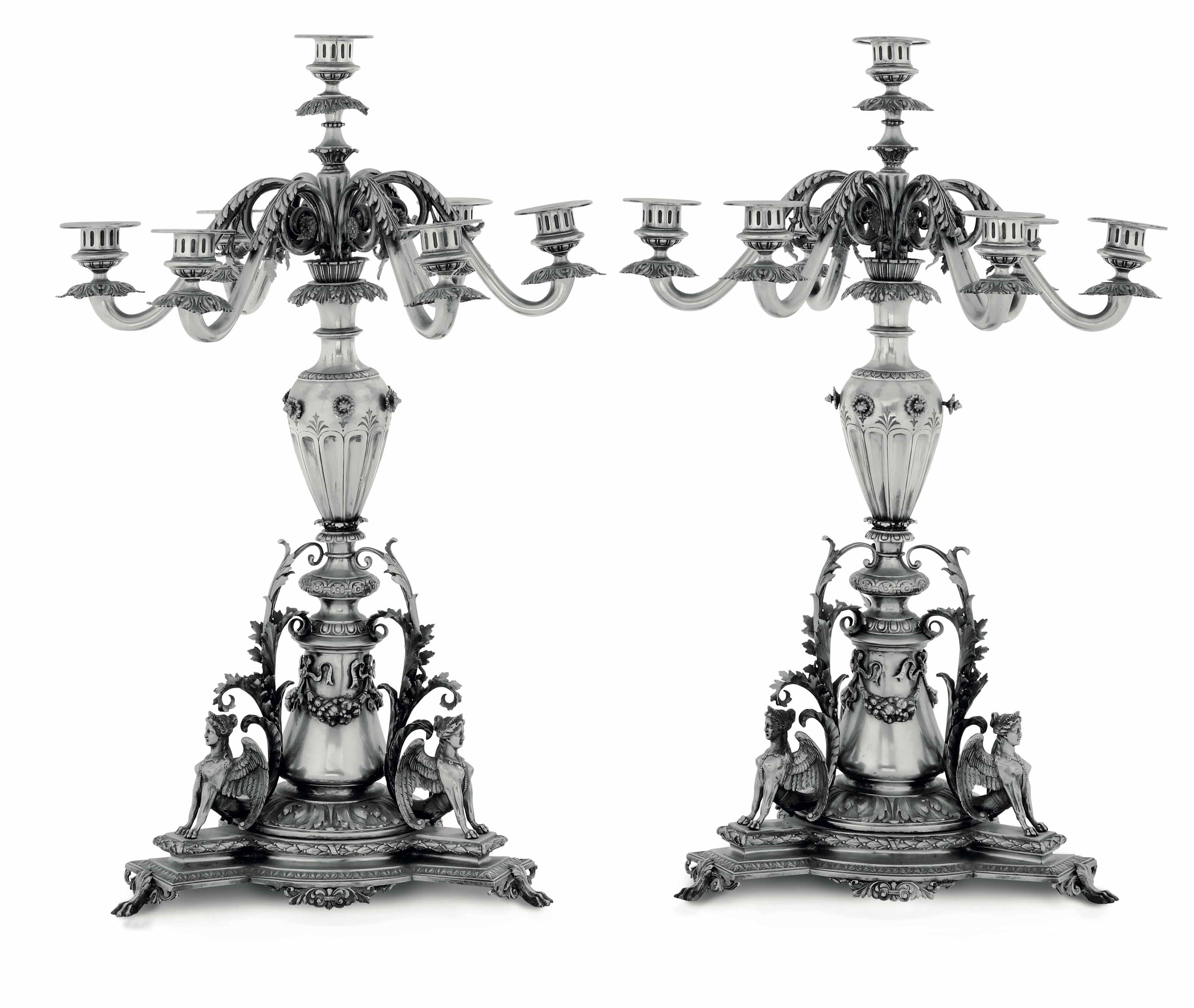 Importante coppia di candelabri a sette fiamme. Argento fuso, sagomato e cesellato. [..]