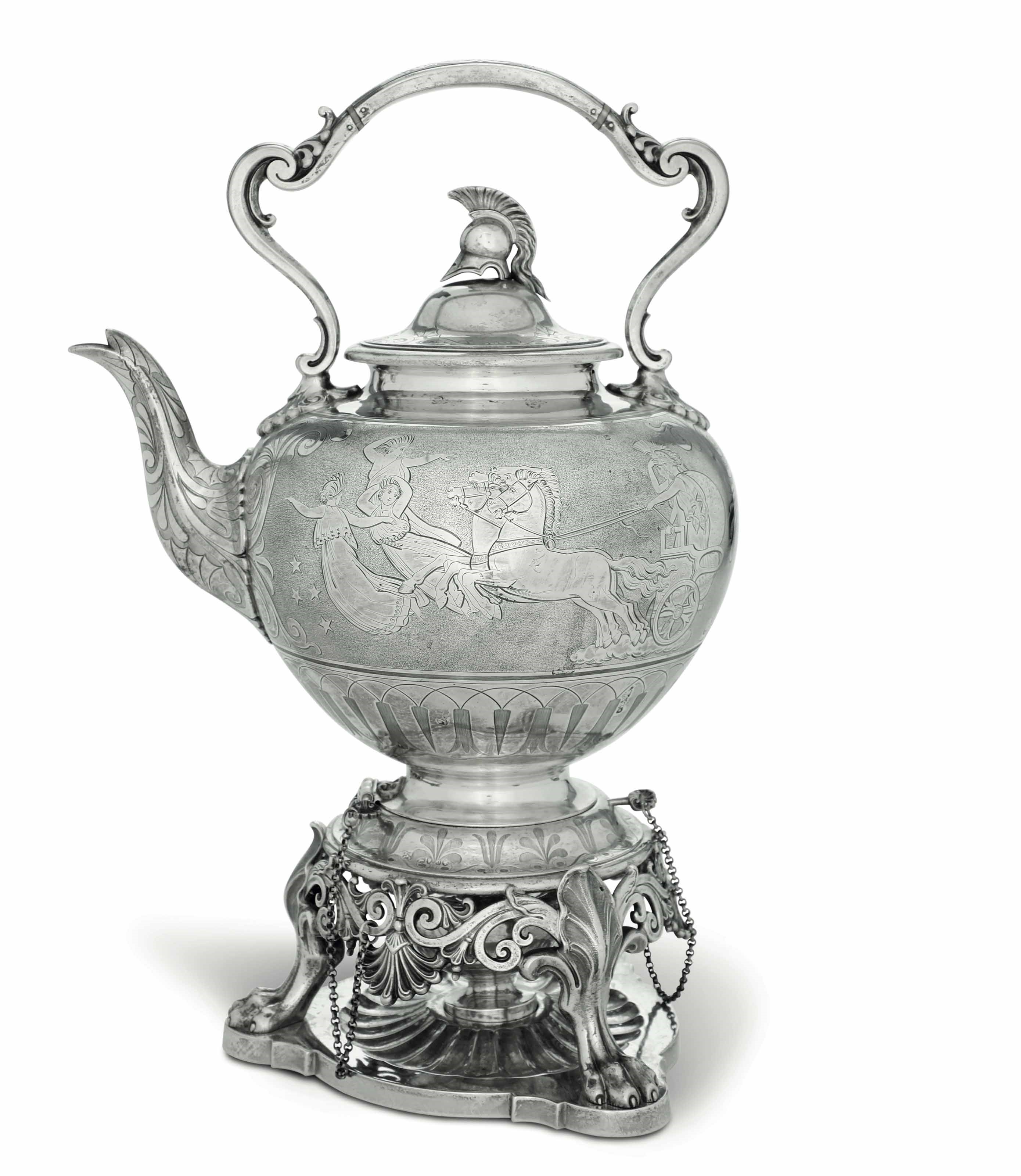 Kettle. Argento sterling fuso, sbalzato e inciso. Londra 1859, argentiere Edward [..]