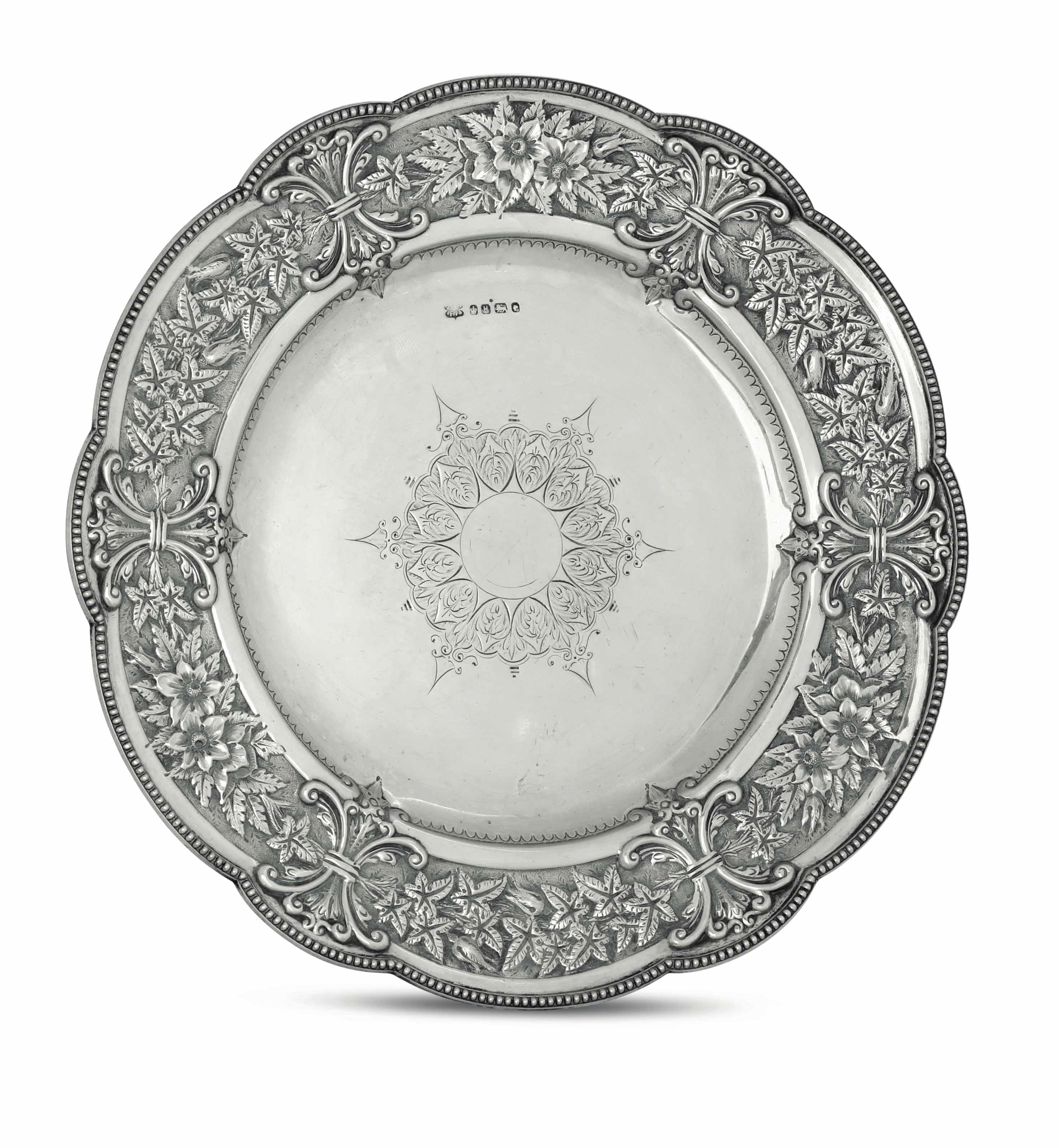 Piatto. Argento sterling fuso e cesellato. Inghilterra, marchio della città di Sheffield [..]