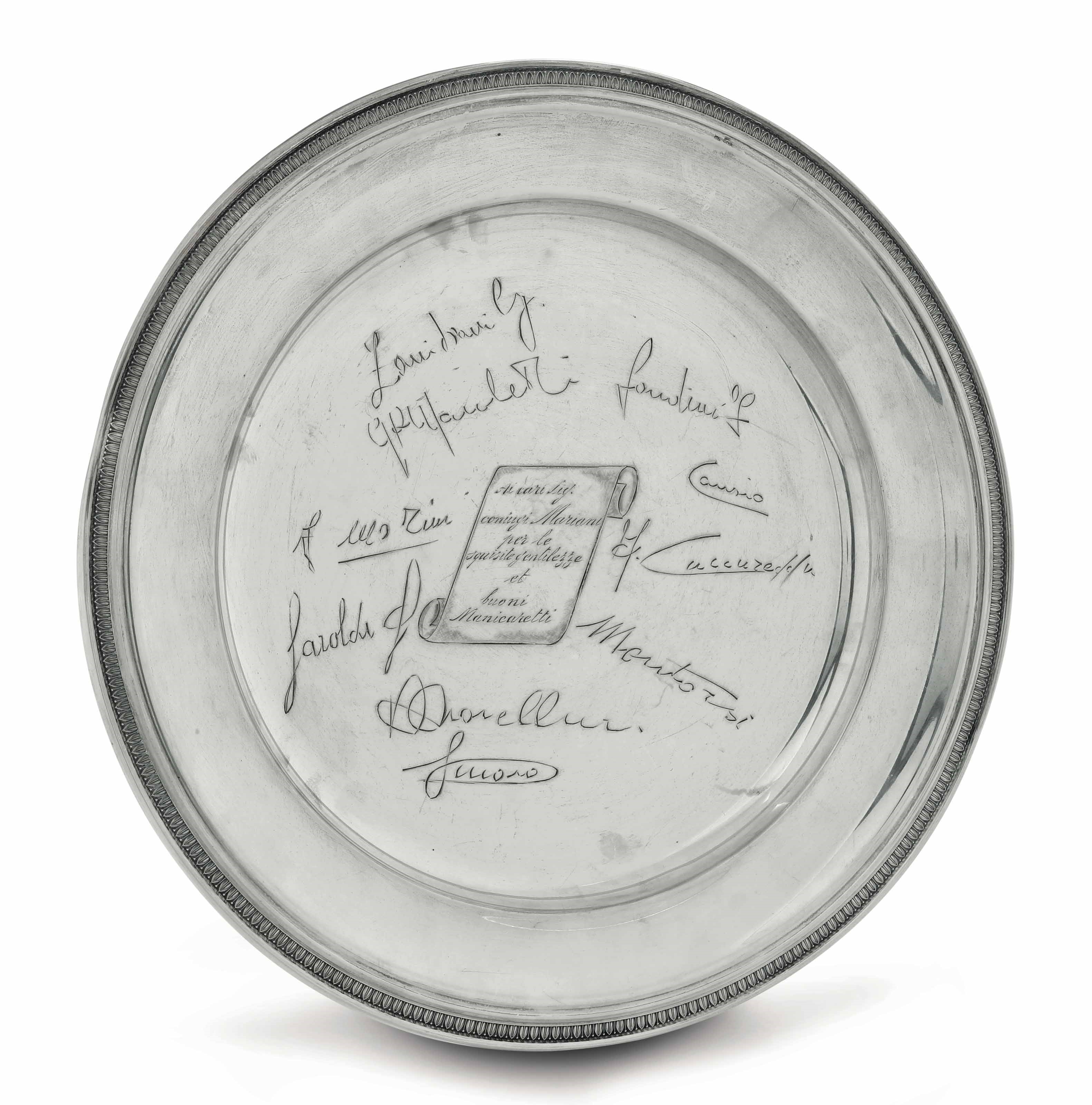Piatto celebrativo. Argento fuso, sagomato e inciso. Argentiere Cesa Alessandria [..]