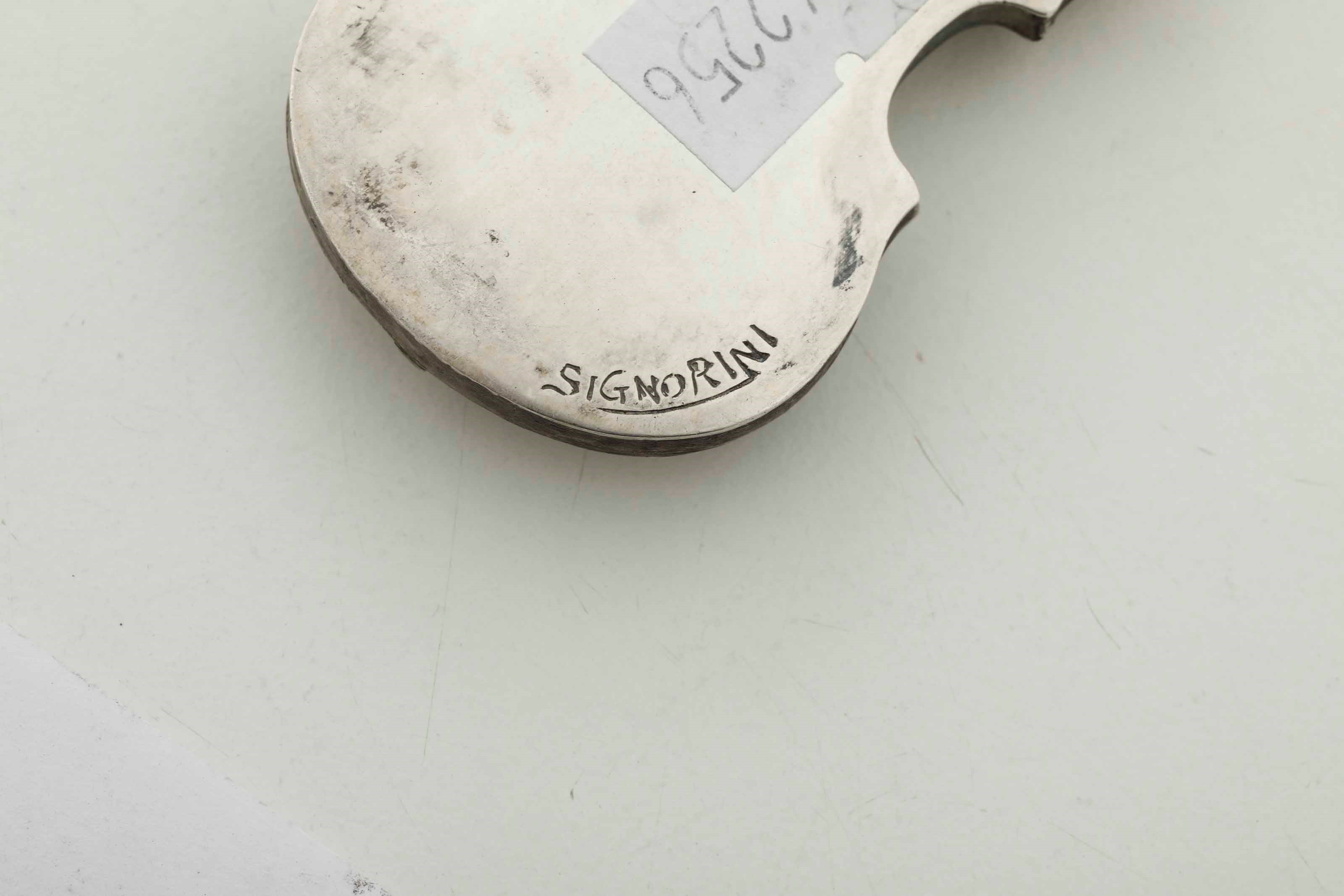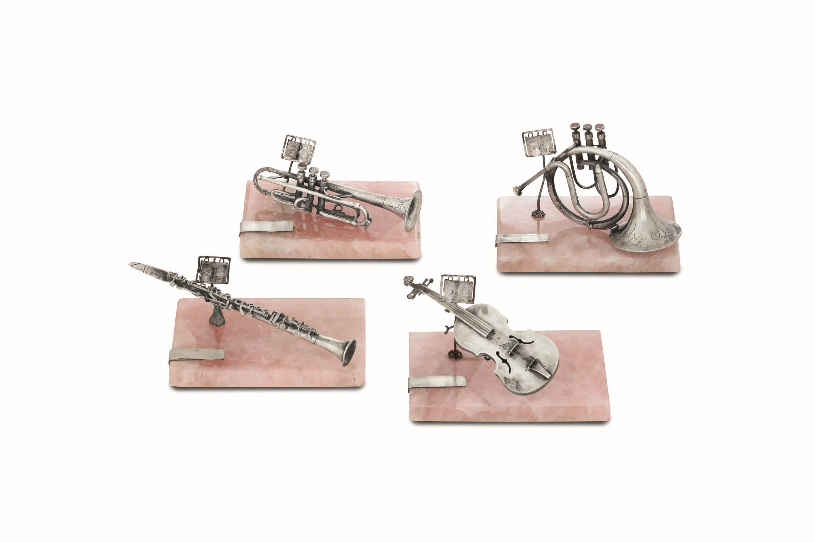 Quattro segnaposto a foggia di strumenti musicali. Argento fuso e sagomato. Argenteria [..]