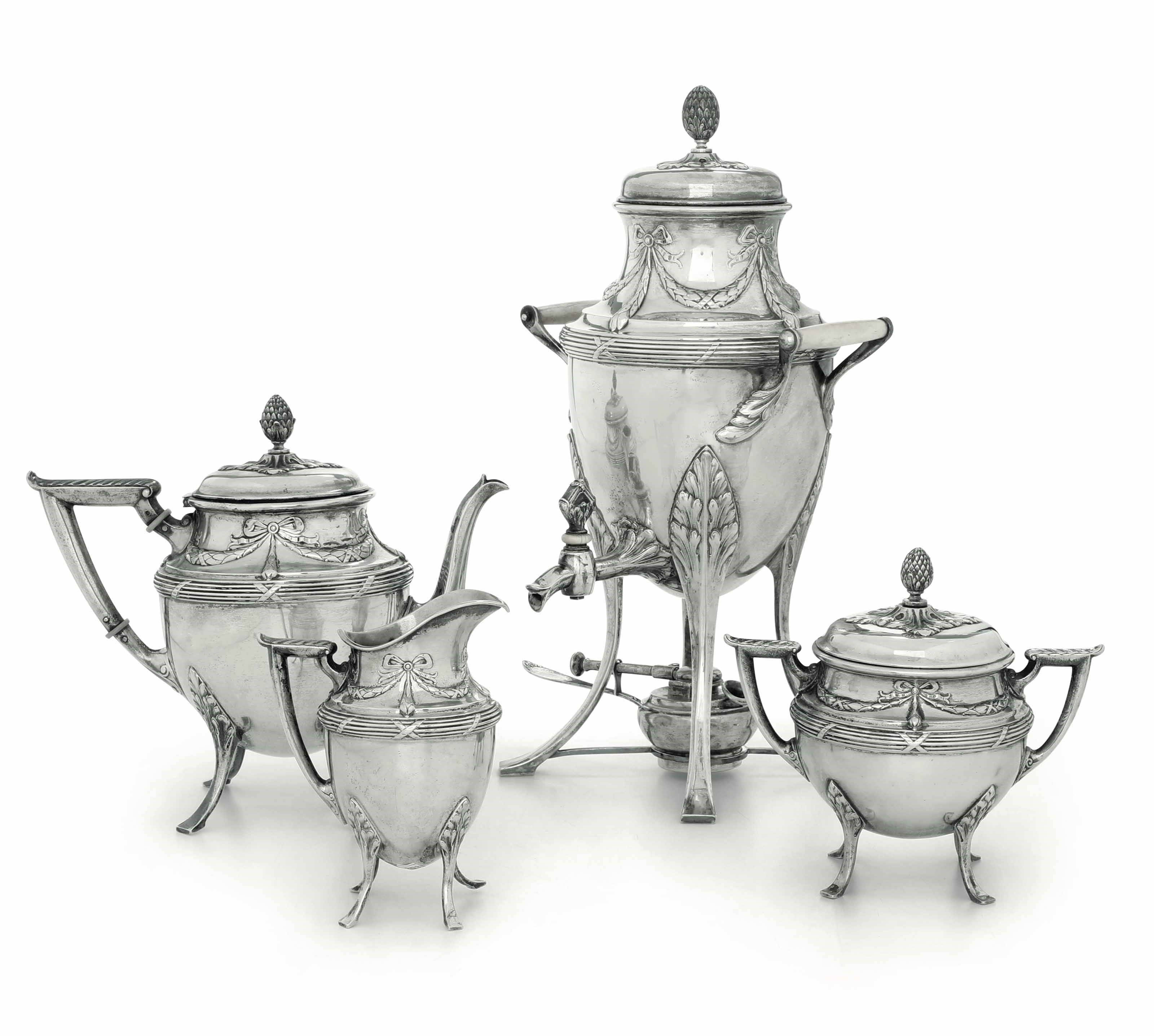 Servizio da tè. Argento fuso, sagomato e cesellato. Germania XIX-XX secolo